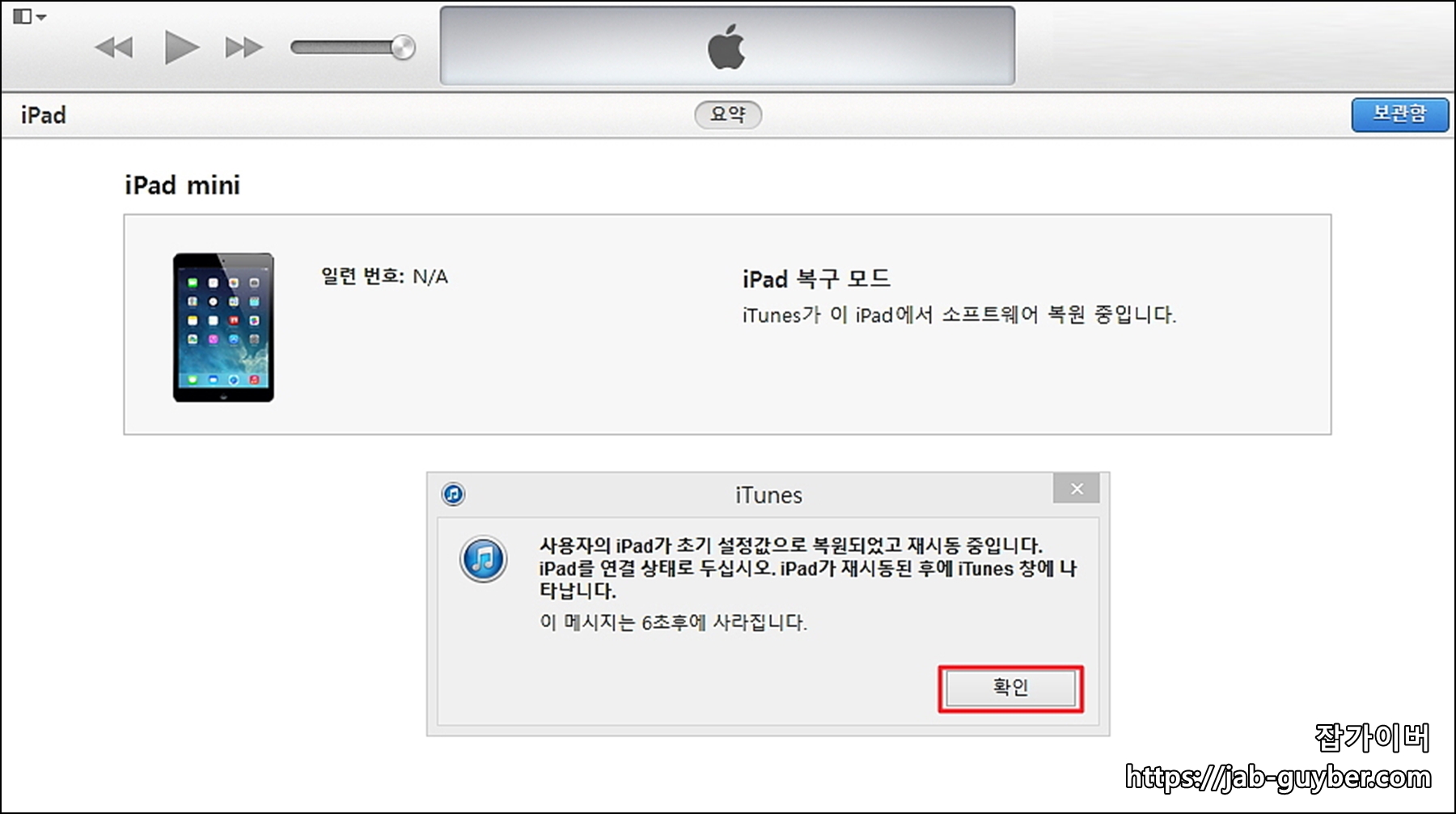 아이튠즈를 통해 사용하기 전에 아이패드 복원을 해야 하며 "확인"버튼을 눌러줍니다.