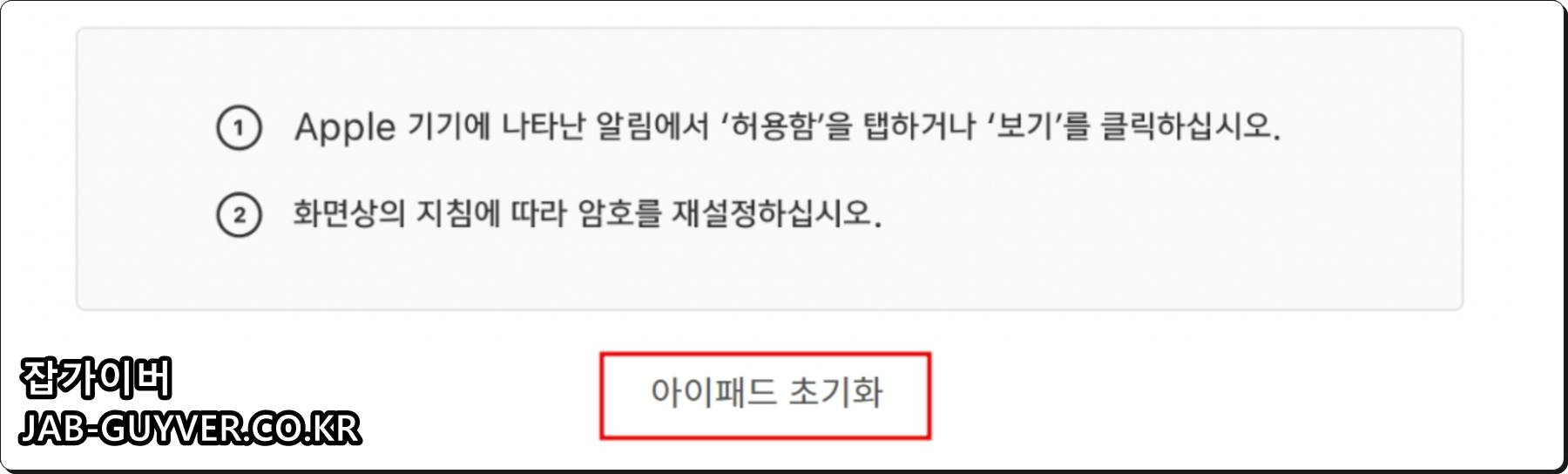 이후 등록된 애플기기 "아이폰, 아이패드, 맥북 등등" 중 잠금 비밀번호를 입력 후 Apple ID 비밀번호 초기화 후 재설정 후 새로운 비밀번호를 재설정하였다면 앞서 설명해 드렸던 아이패드 기기에서 공장 초기화를 진행하시면 됩니다.