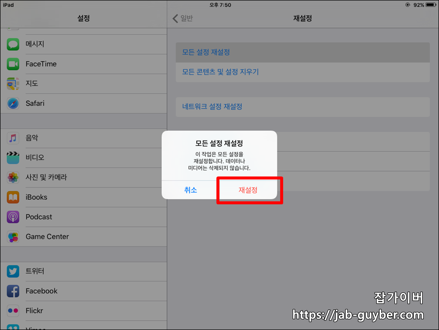 가장 위에 있는 모든 설정 재설정은 사용하면서 아이패드의 설정값을 이리저리 만진 경우 아이패드의 사진이나 음악 등 디스크 안에 있는 데이터는 모두 유지한 채로 설정값만을 초기화합니다.