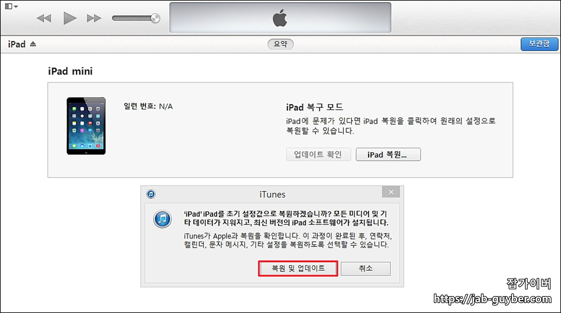 복구 알림이 뜨면 iPad 복원 또는 복원 및 업데이트를 선택해 초기화를 진행합니다.