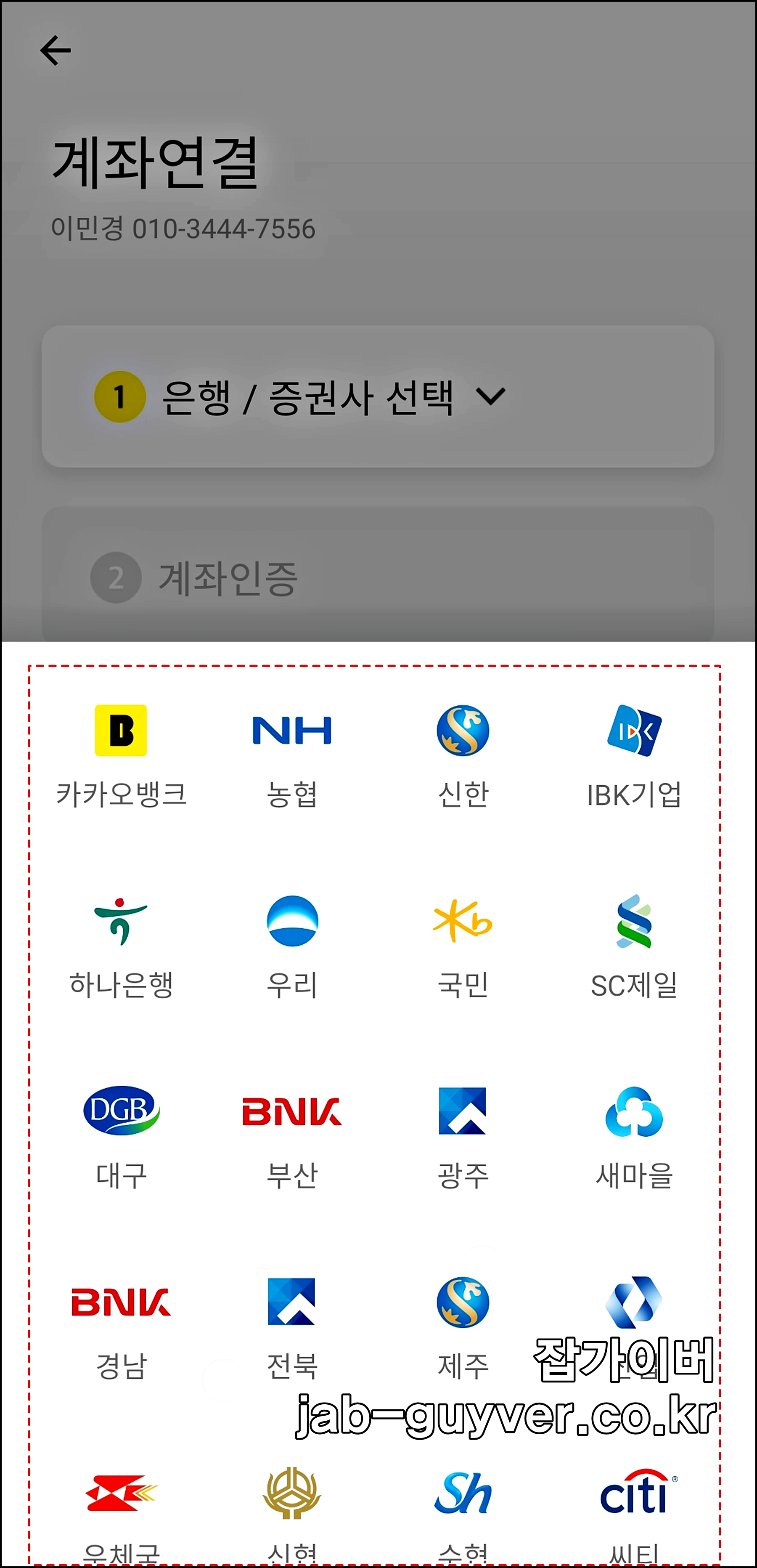 기본적으로 카카오 뱅크, 농협, 신한, IBK기업, 하나은행, 우리은행, 국민은행, SC제일은행, 대구은행, 부산은행, 광주은행, 새마을은행, 경남은행, 전북은행, 제주은행, 우체국, 신협, 수협, 시티 등등 다양한 은행을 지원합니다.