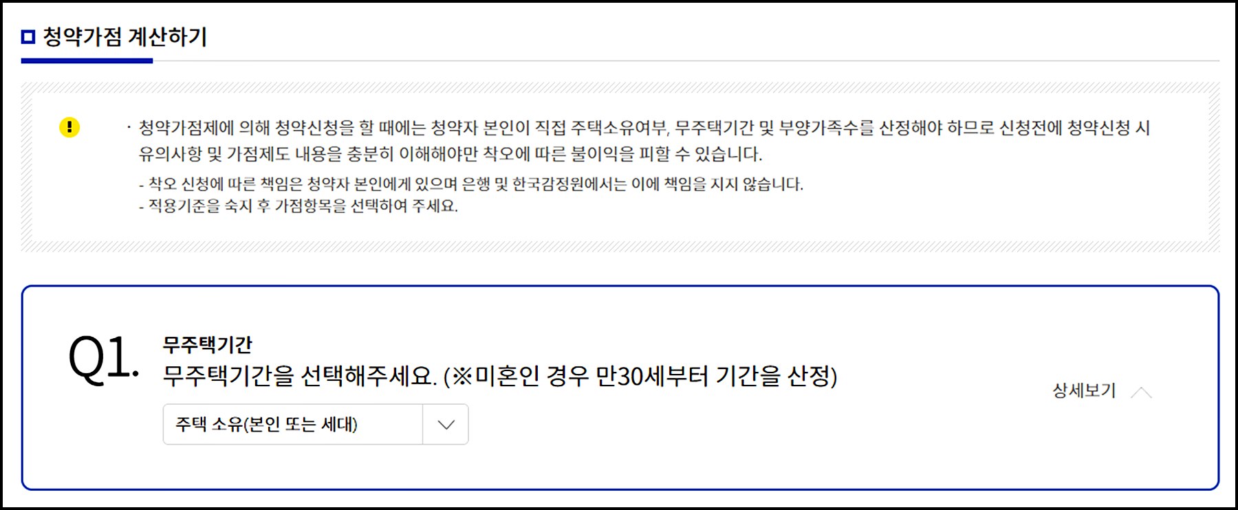 - 기본적으로 무주택 기간 등을 이용해 자신의 가점을 확인할 수 있습니다.