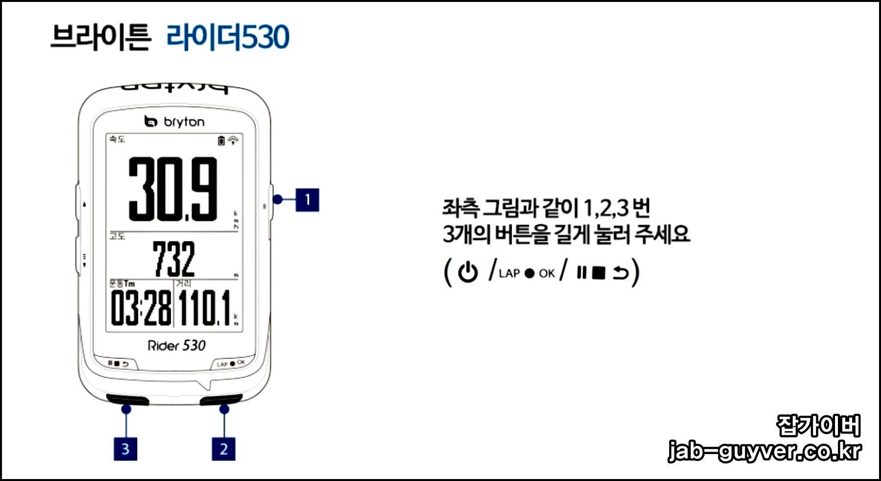 - 브라이튼 라이더530 모델의 경우 우측 상단과 하단 2개에 버튼이 존재합니다.