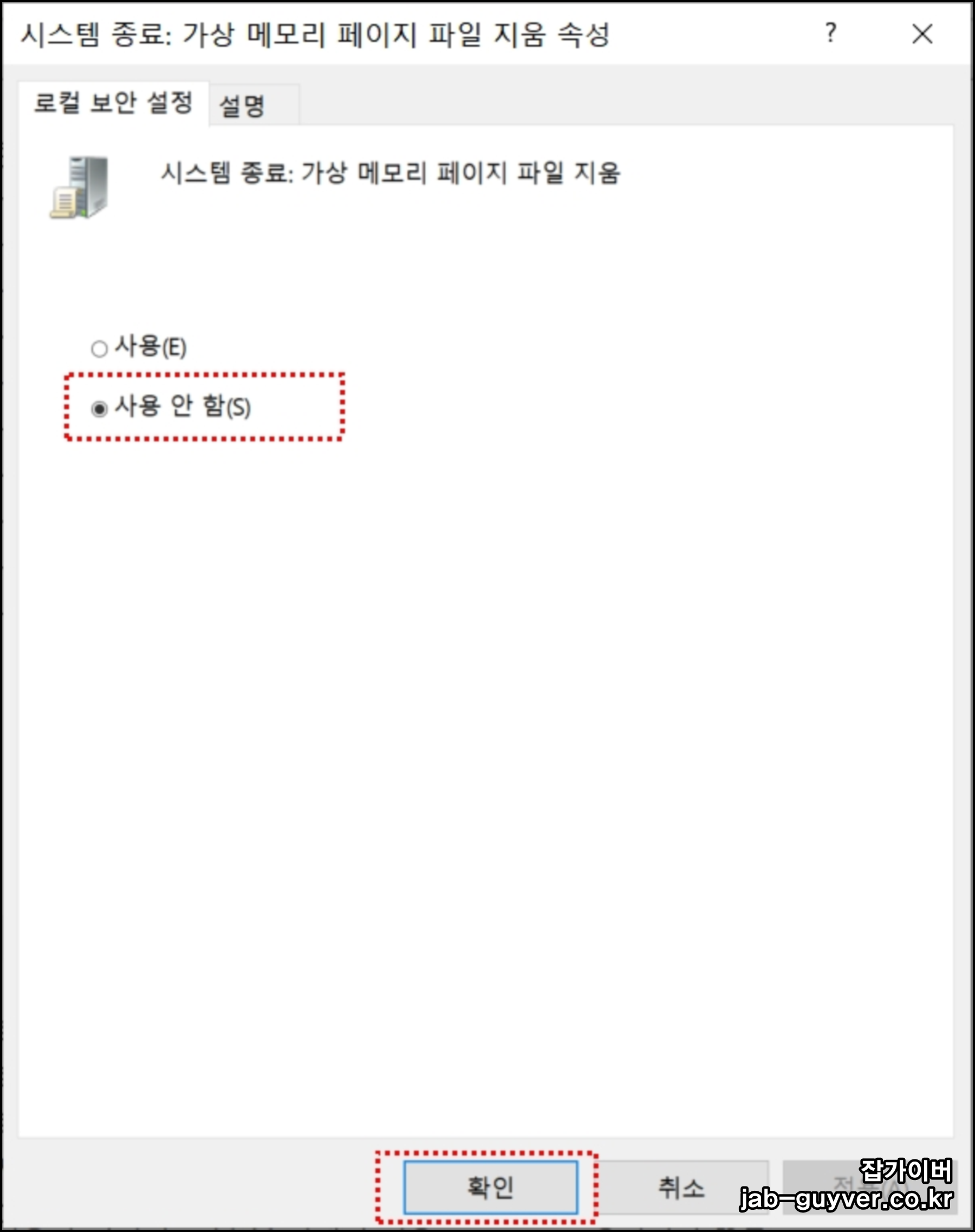 - 시스템종료 : 가상메모리 페이지 파일 지움을 사용안함으로 선택합니다.