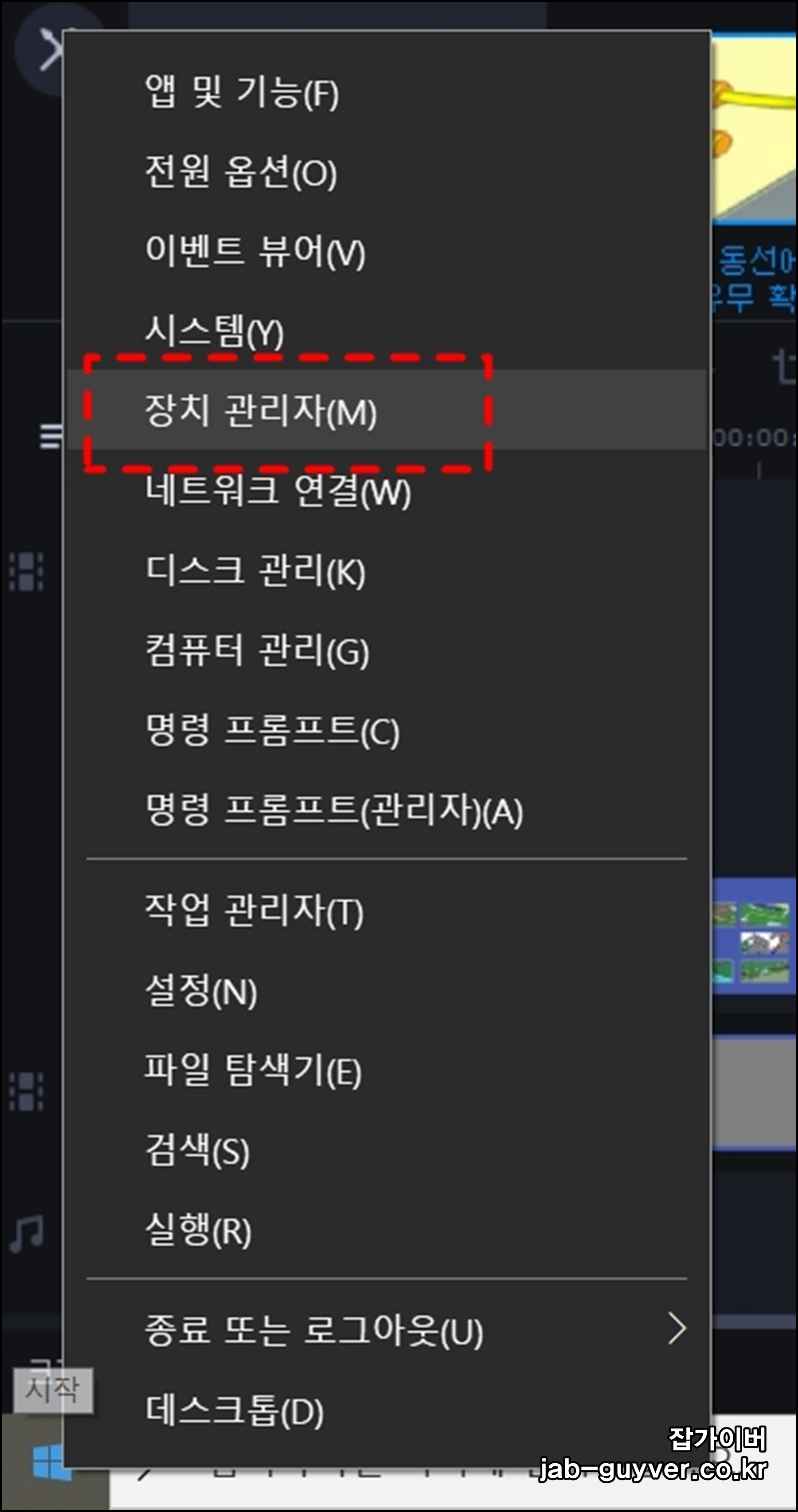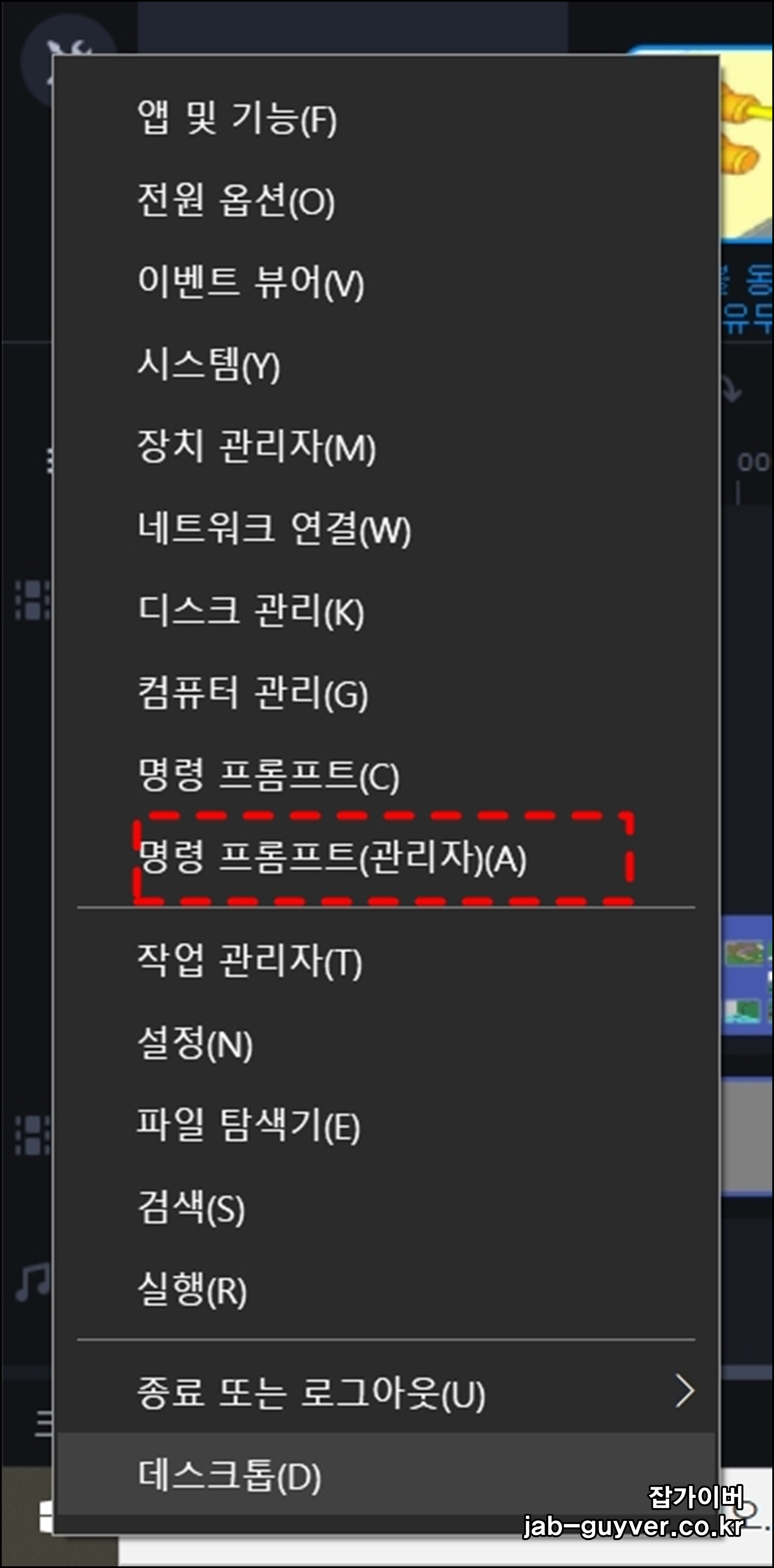 - 윈도우 로고 마우스 우클릭 (단축키 : 윈도우 키 + X)