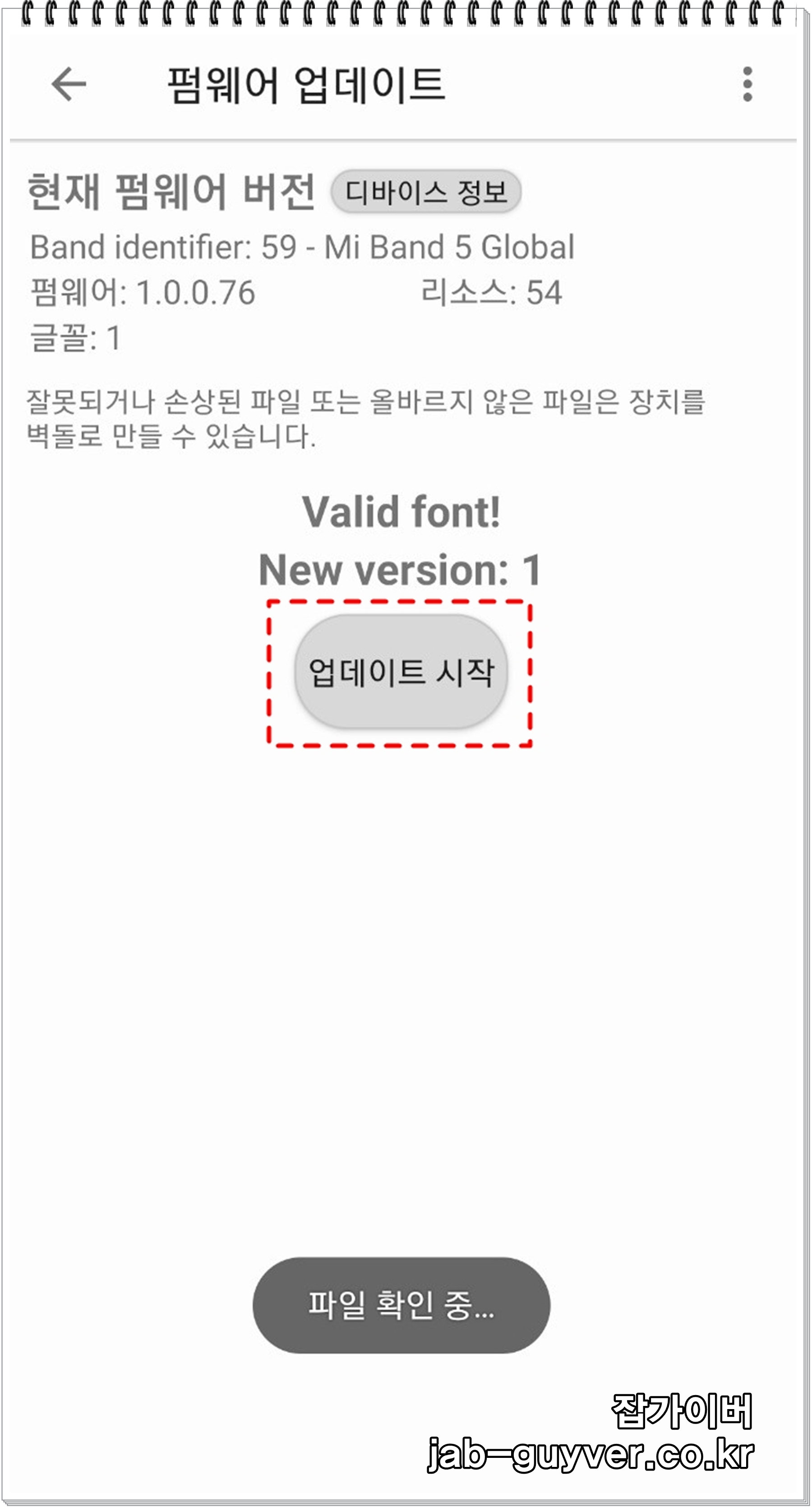 - 미밴드에서 ??? 라는 글씨가 보이는등 글씨가 제대로 보이지 않는다면 폰트 업데이트를 해야합니다.