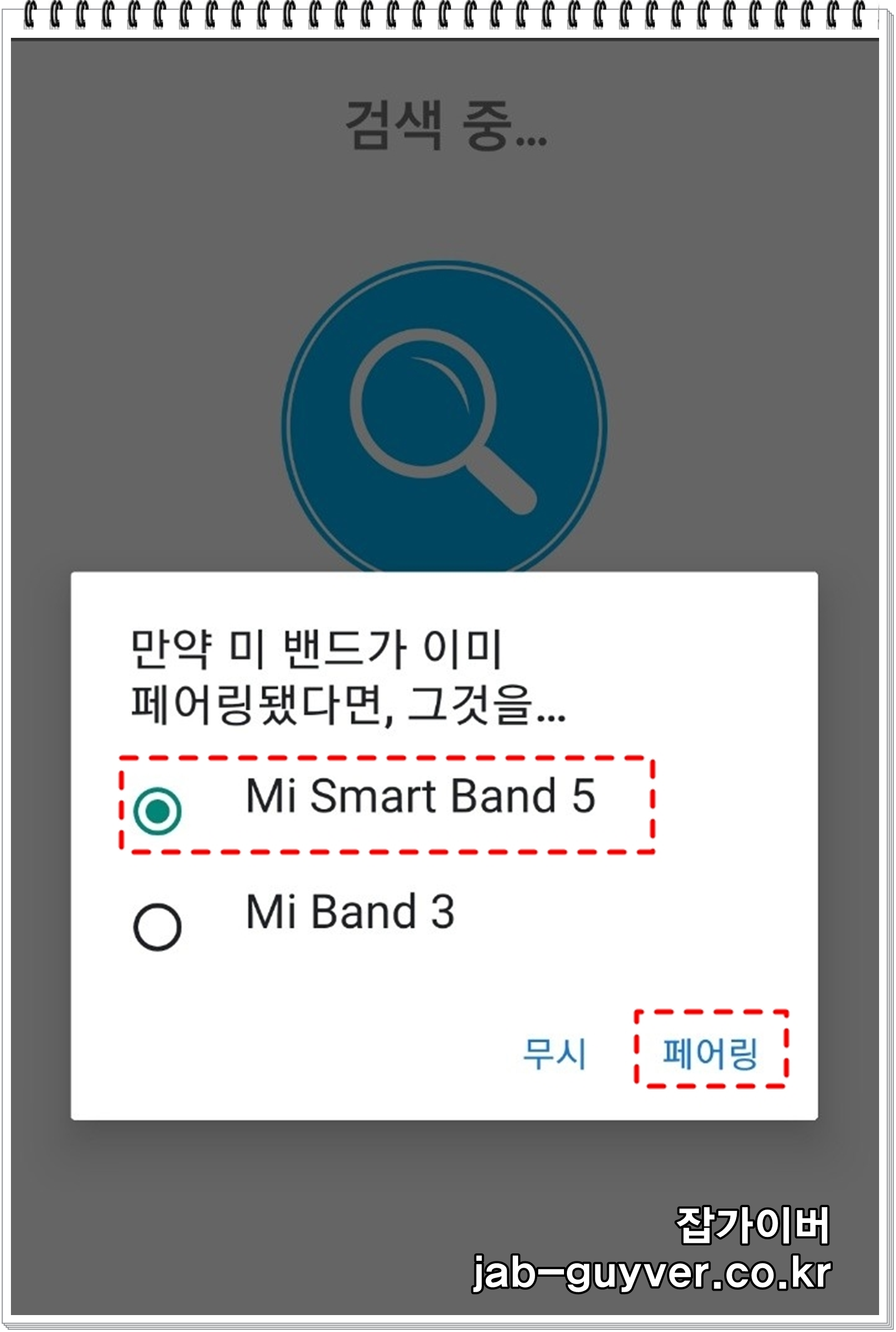 - 블루투스 기능을 활성화 후 해당 앱을 실행해 미밴드5와 페어링합니다.