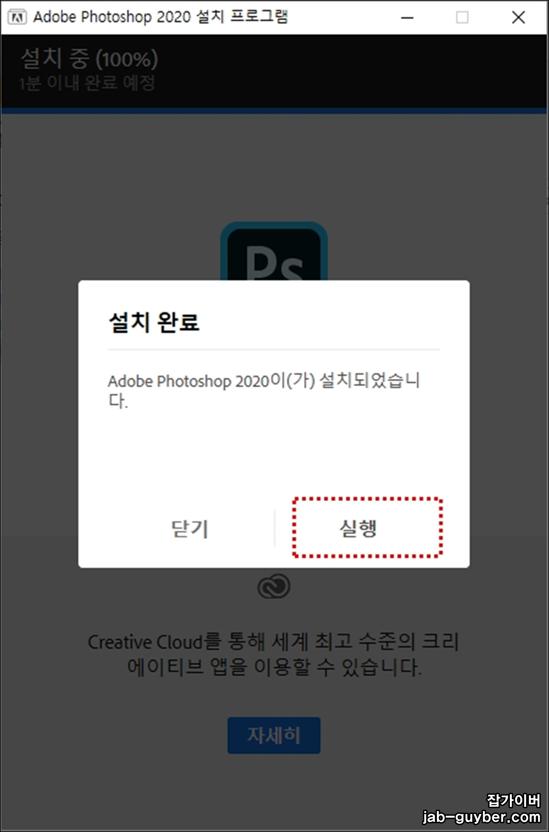 설치 완료 후 "실행"을 눌러주면 자동으로 설치 완료 후 포토샵이 실행됩니다.