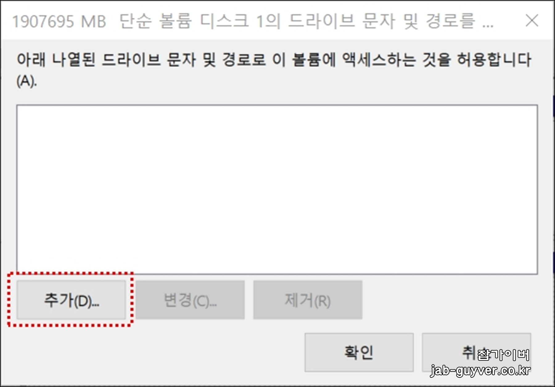 현재 새로구입한 외장하드라 사용할 드라이브 문자가 없어 인식이 되지 않는 것으로서 사용하고자 하는 드라이브 문자를 선택합니다.