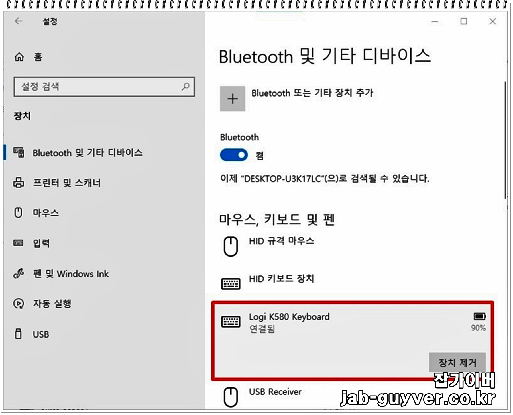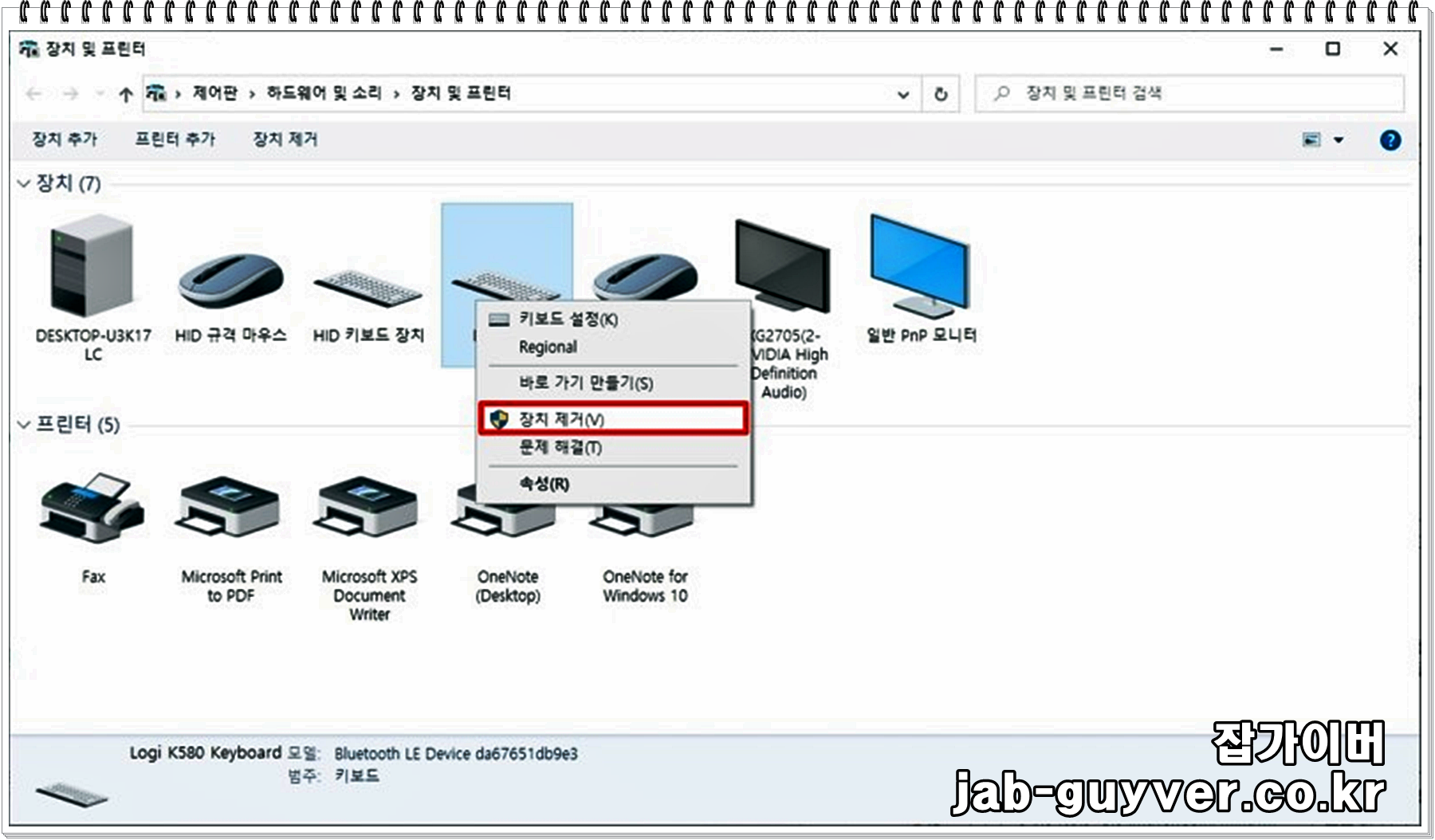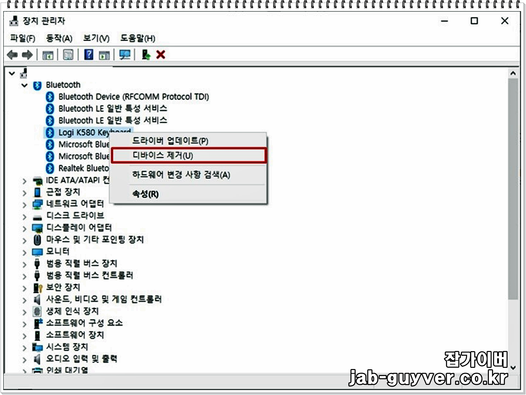 제대로 인식이 되지 않는 블루투스나 기타 장치 등이 있다면 여기서 "디바이스 제거"를 확실하게 할 수 있습니다.
