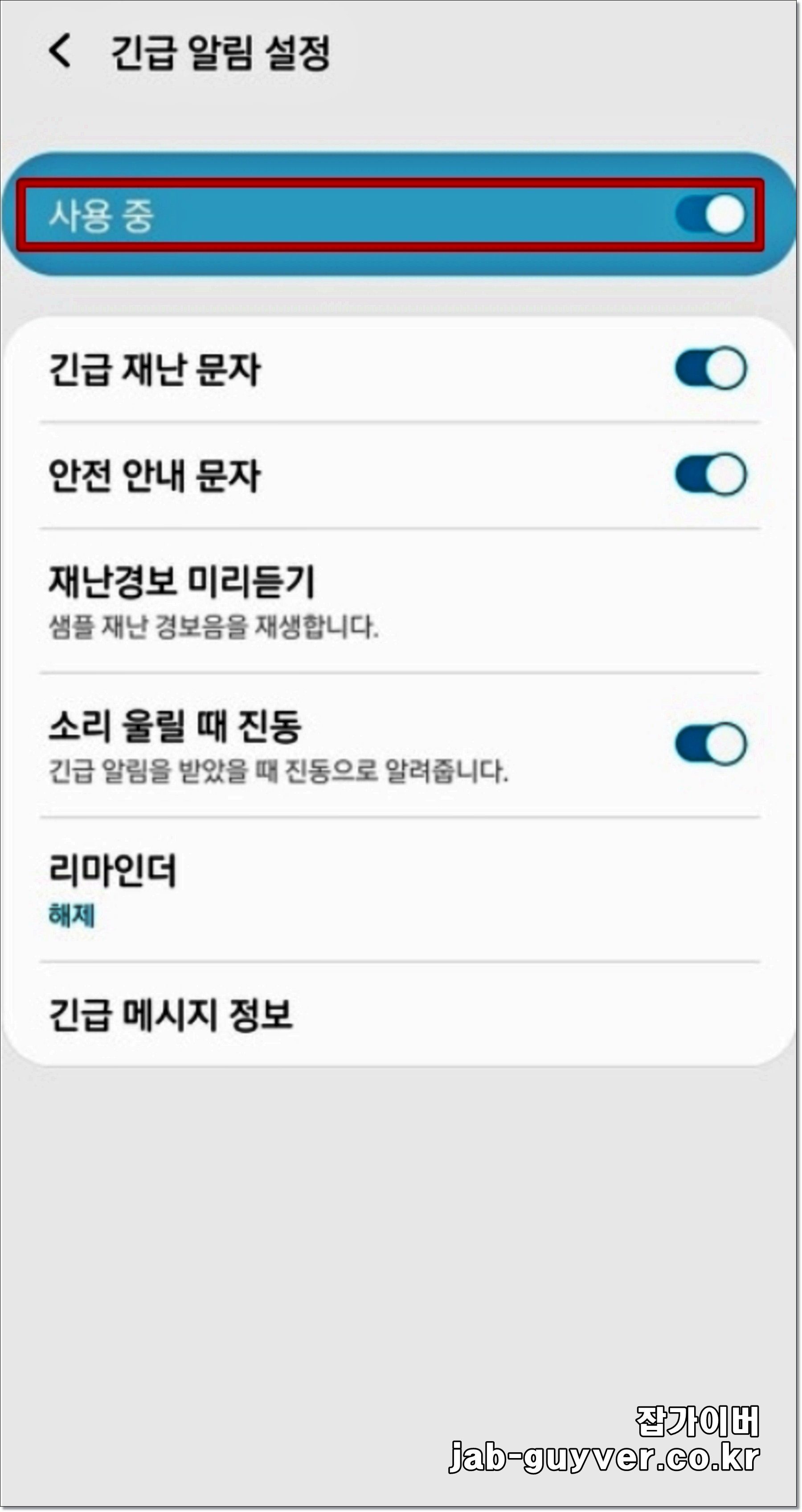 기본값으로 긴급 알림 설정이 활성화되어 있으며 재난문자를 받고 싶지 않다면 "비활성화"합니다.