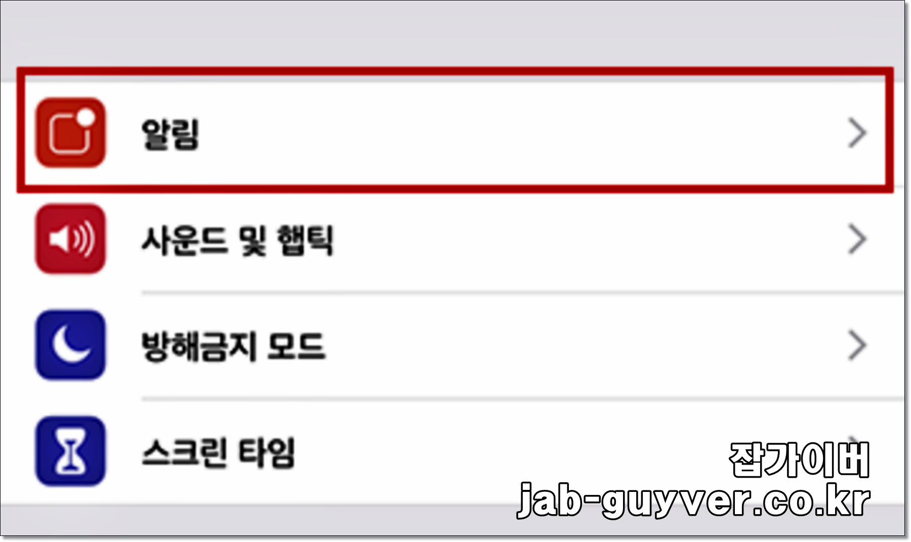 설정 항목 중 "알림"항목을 선택합니다.