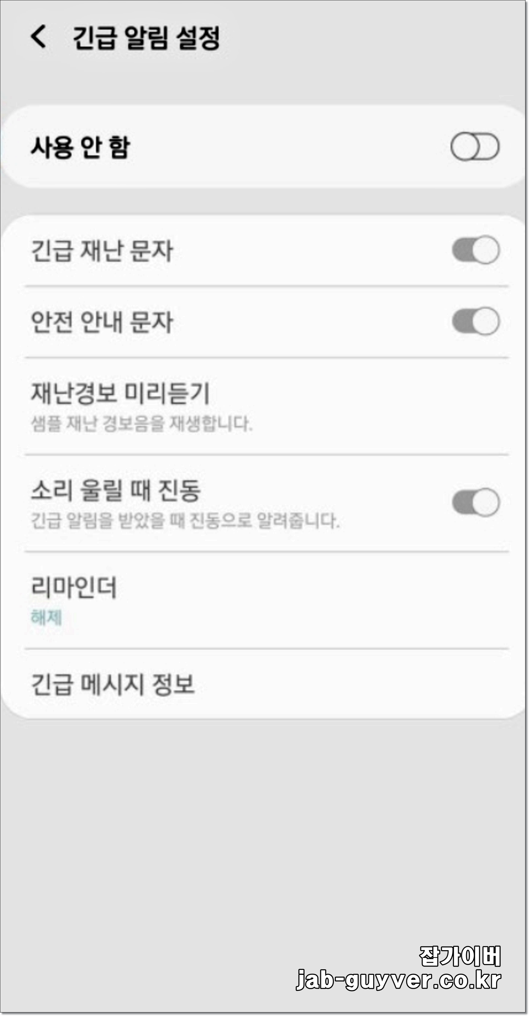 기본값으로 긴급 알림 설정이 활성화되어 있으며 재난문자를 받고 싶지 않다면 "비활성화"합니다.