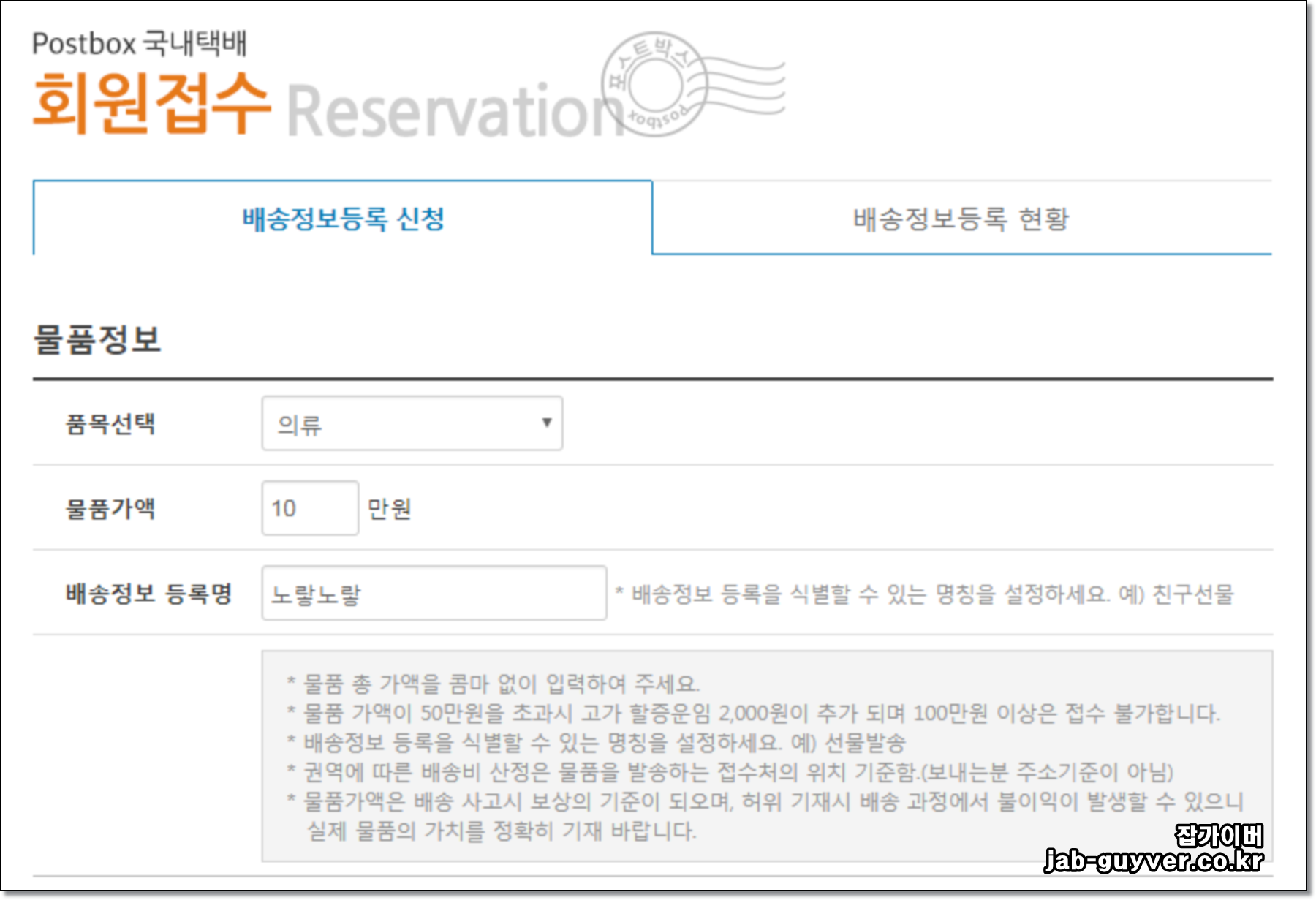 포스트박스 사이트에서 배송정보 등록 메뉴를 찾는 화면 예시입니다.