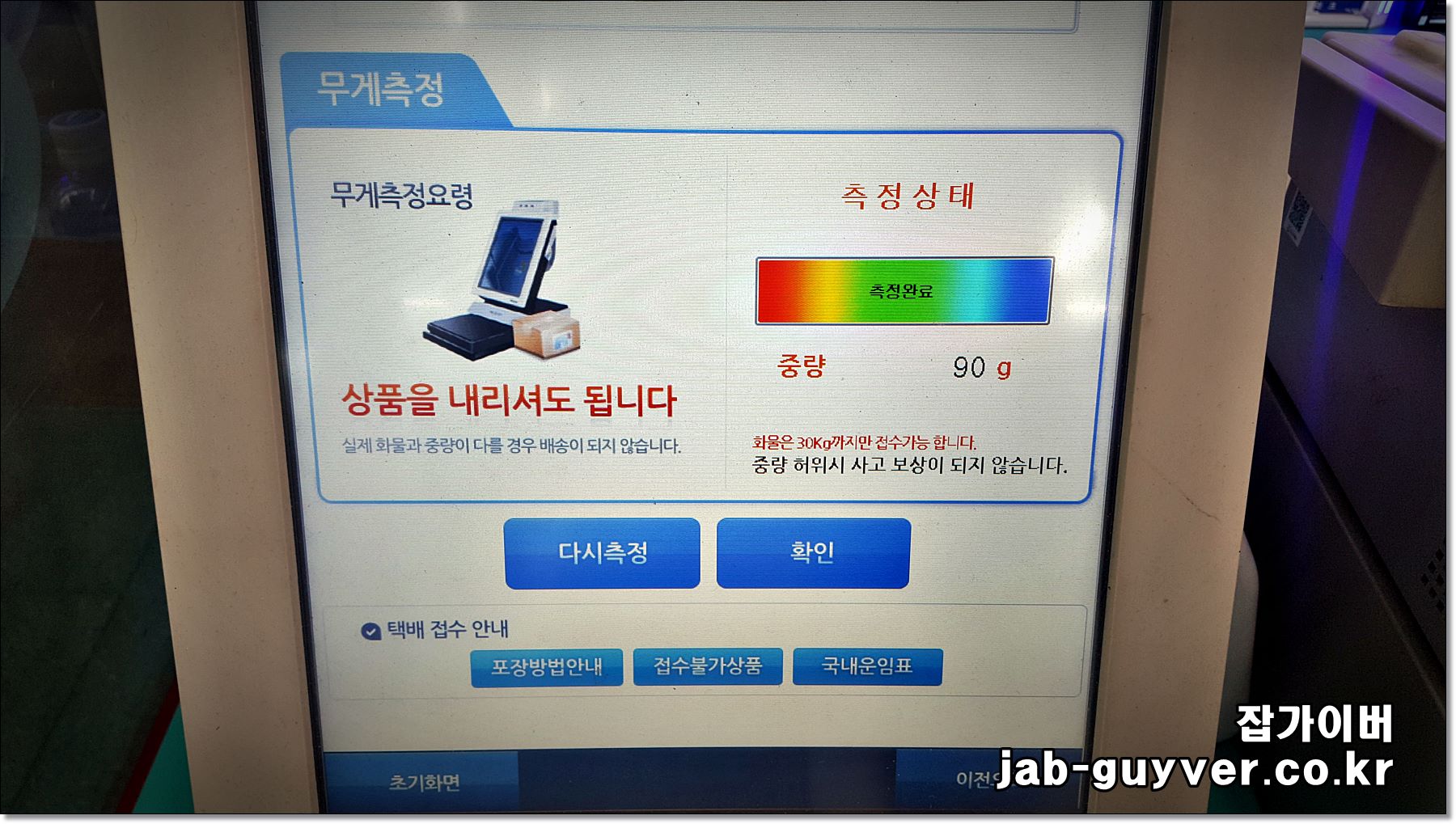 무게를 재면 영수증이 출력되고, 그 영수증(운송장)을 박스에 붙인 뒤 카운터에서 결제합니다.
