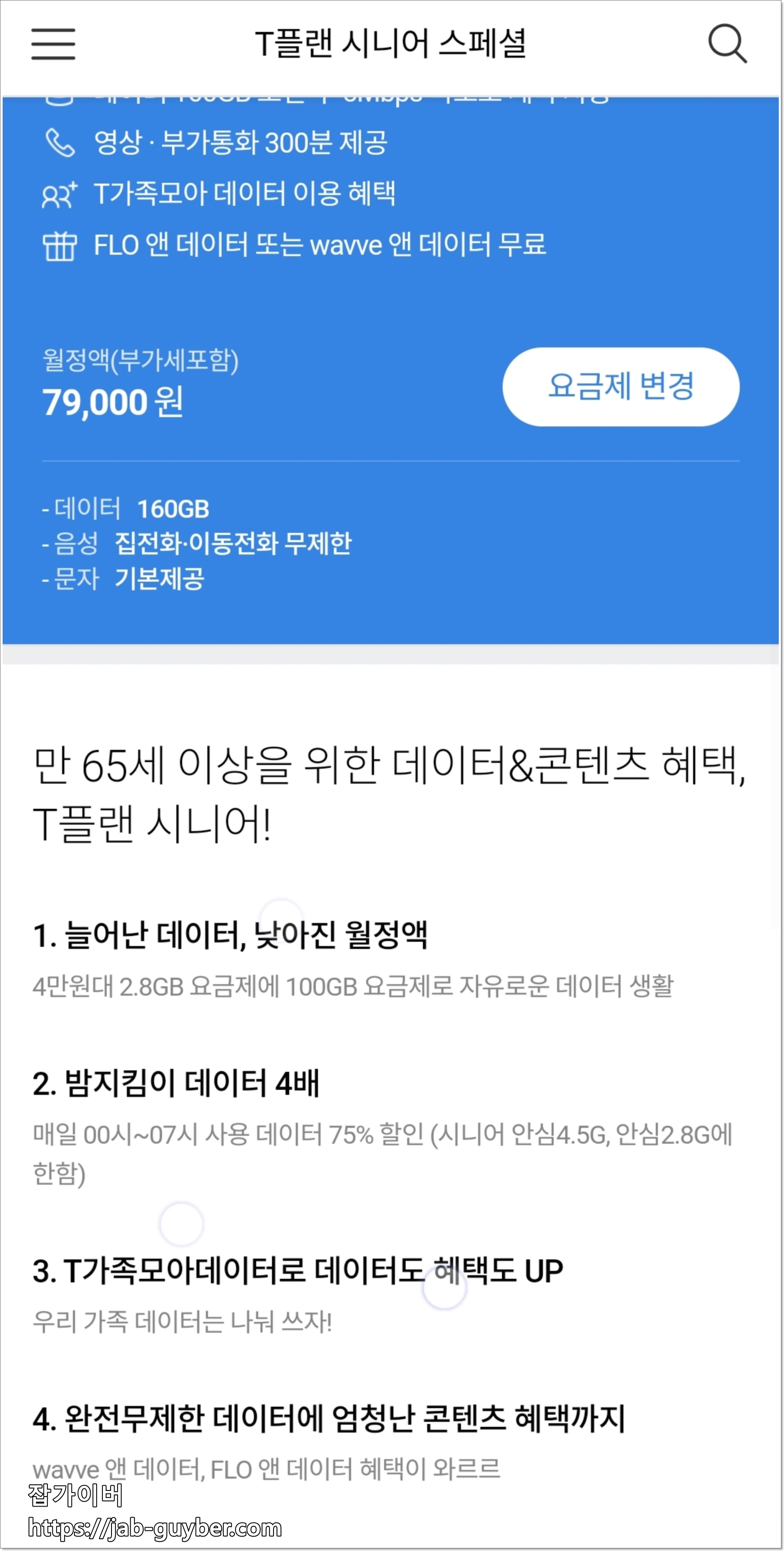 | T플랜 시니어 스페셜 | 79,000원 | 160GB + 5Mbps | 데이터 많이 쓰는 시니어, FLO/WAVVE 포함 | |