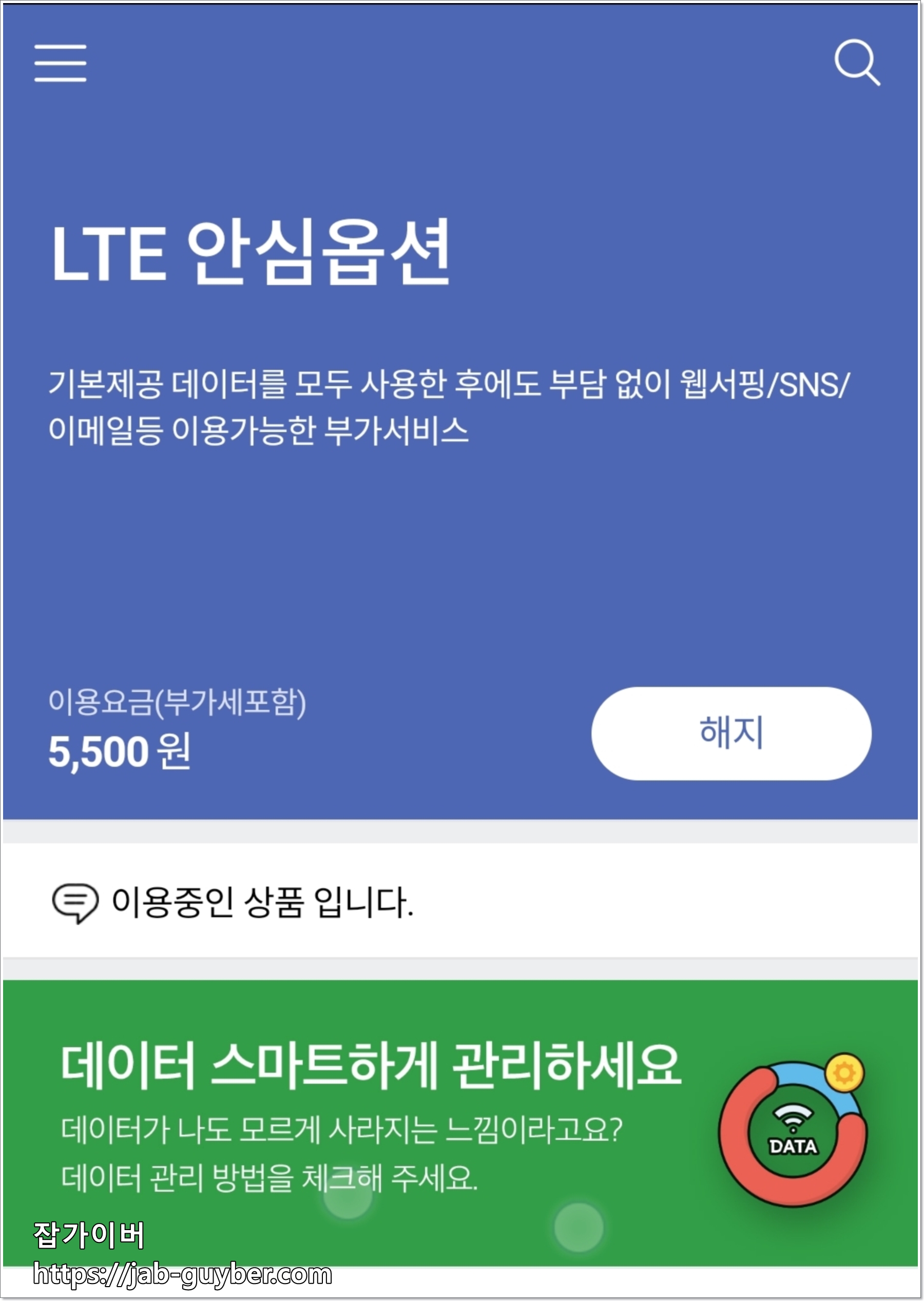 | 데이터 보조 | LTE 안심옵션 | 5,500원 | 데이터 소진 후에도 저속 무제한 (최대 400kbps) |