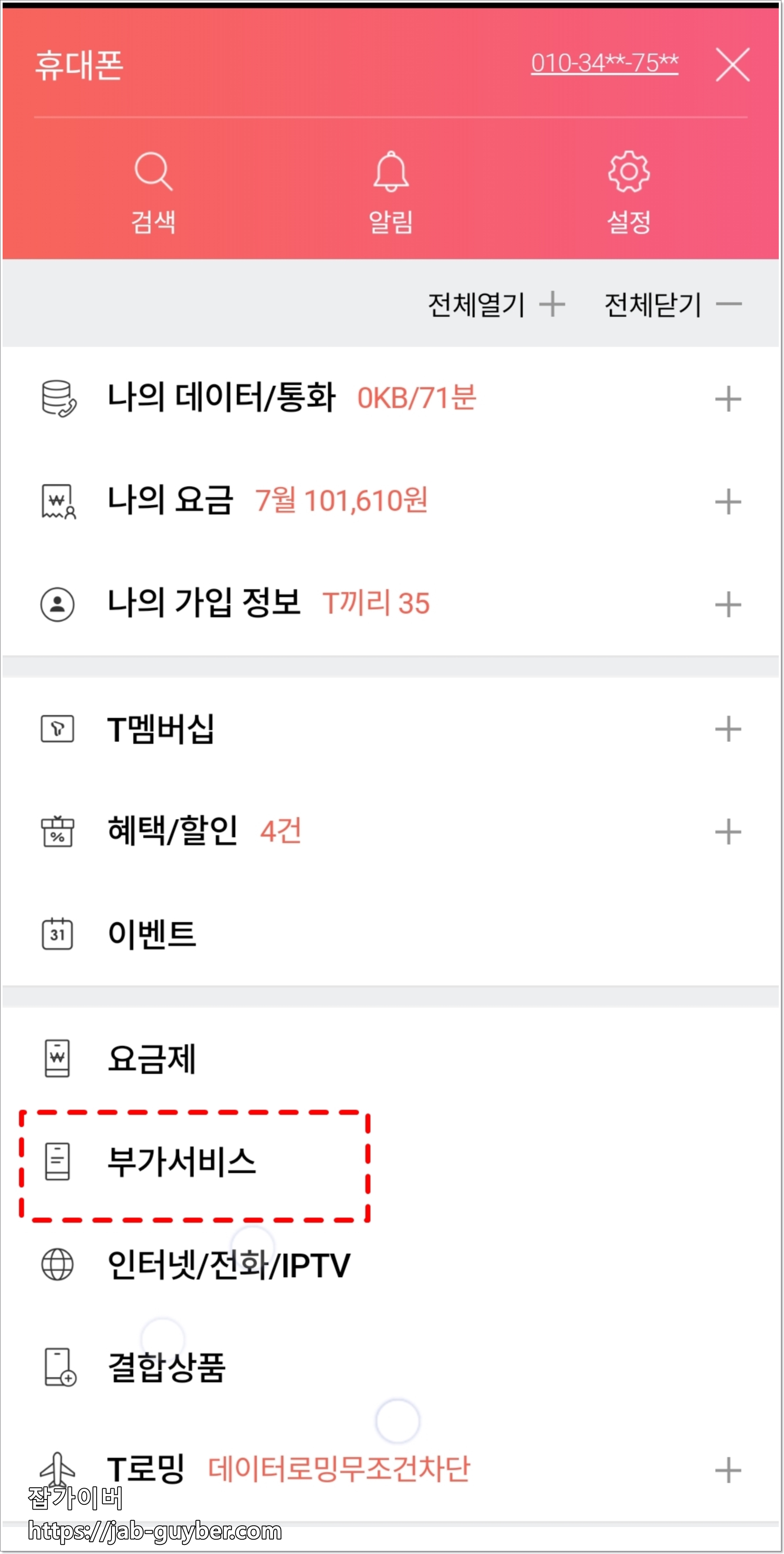 요금제 변경 밑에 부가서비스 탭을 통해 부가서비스를 변경하거나 취소할 수 있습니다.