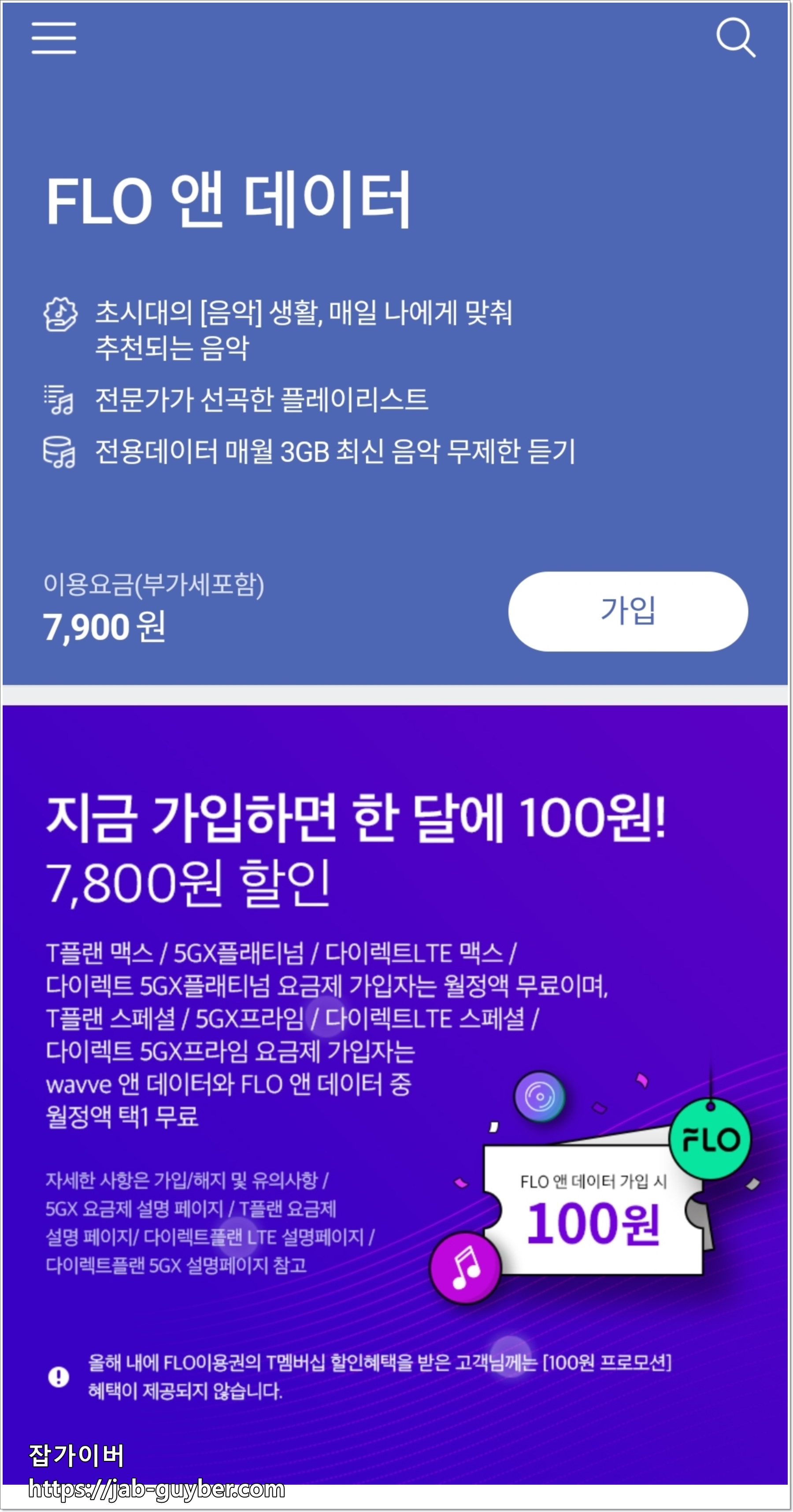 예를 들어, T플랜 플레인에는 FLO 월정액이 포함되어 있지만, 다른 요금제에서는 FLO 앤 데이터(7,900원/월)를 부가서비스로 따로 신청해야 합니다.
