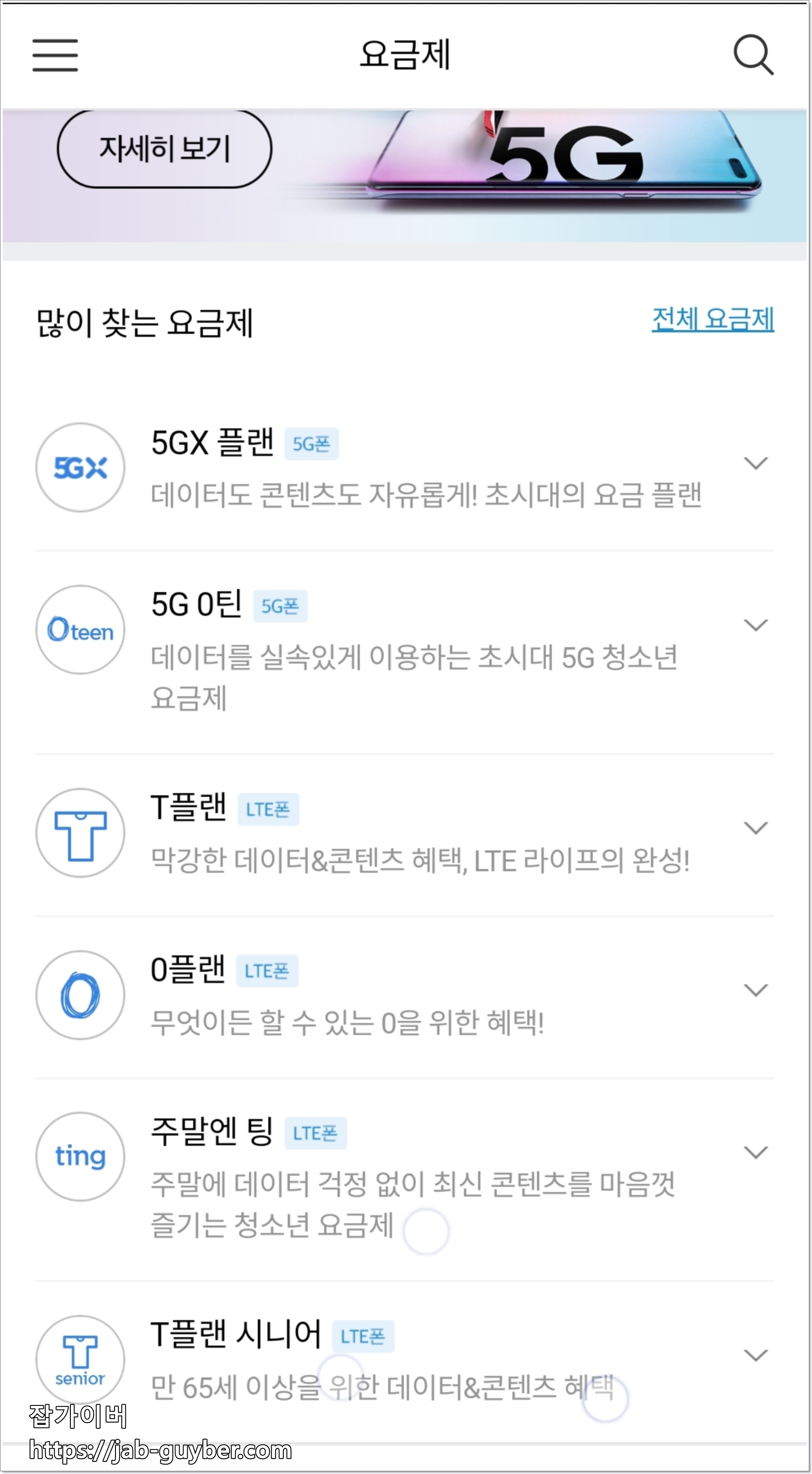 로그인 후 메뉴의 요금제 항목을 선택하면 사람들이 가장 많이 찾는 6가지 요금제를 볼 수 있으며 가격과 데이터와 문자서비스 등을 바로바로 알 수 있습니다.