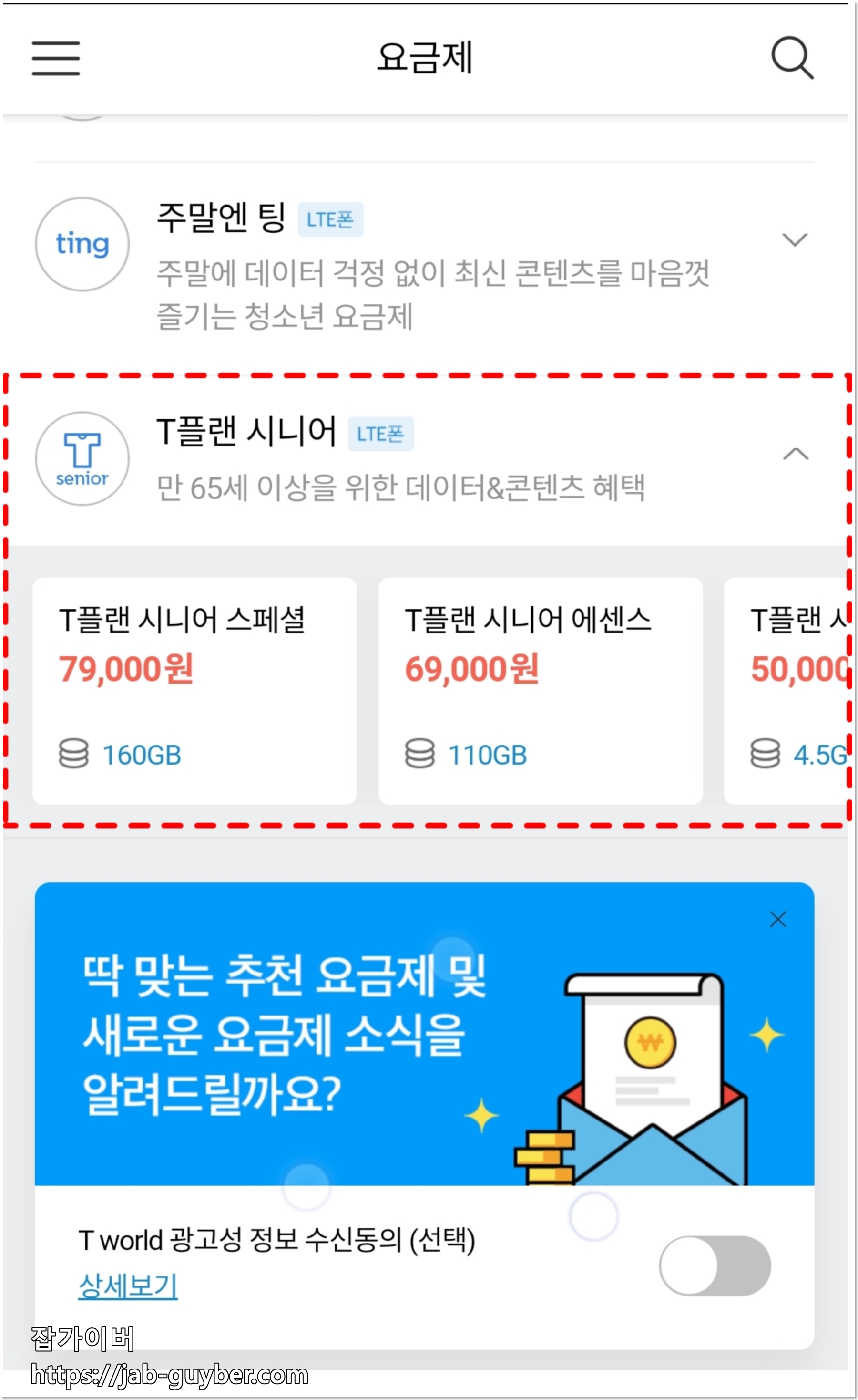 | 시니어 요금제 | T플랜 시니어 에센스 | 69,000원 | 110GB + 5Mbps | 만 65세 이상, 콘텐츠 포함, 가족 데이터 공유 가능 |