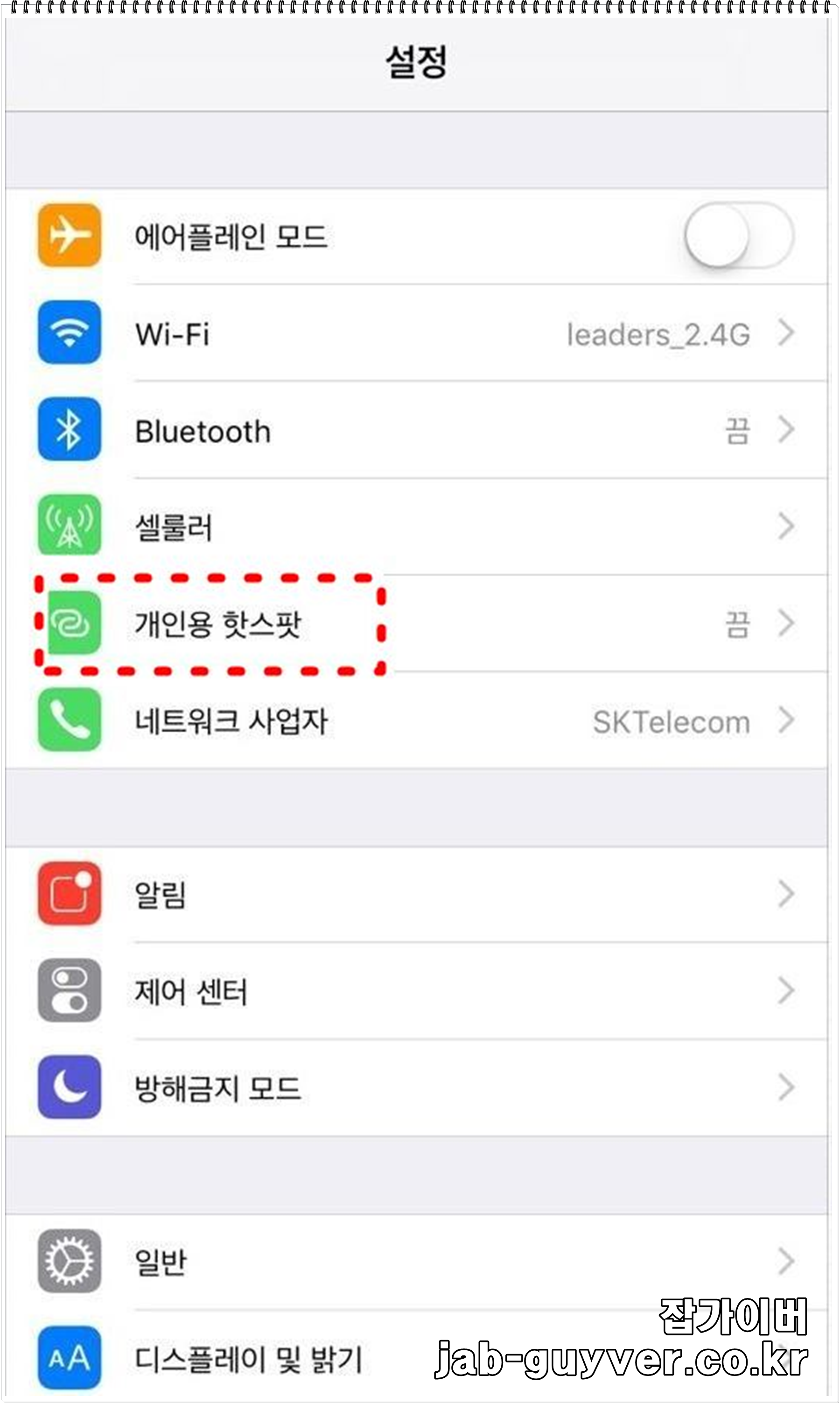 개인용 핫스팟 현재 "끔" 상태로 개인용 핫스팟으로 들어가면 핫스팟 켜기기능을 통해 활성화 할수 있습니다.