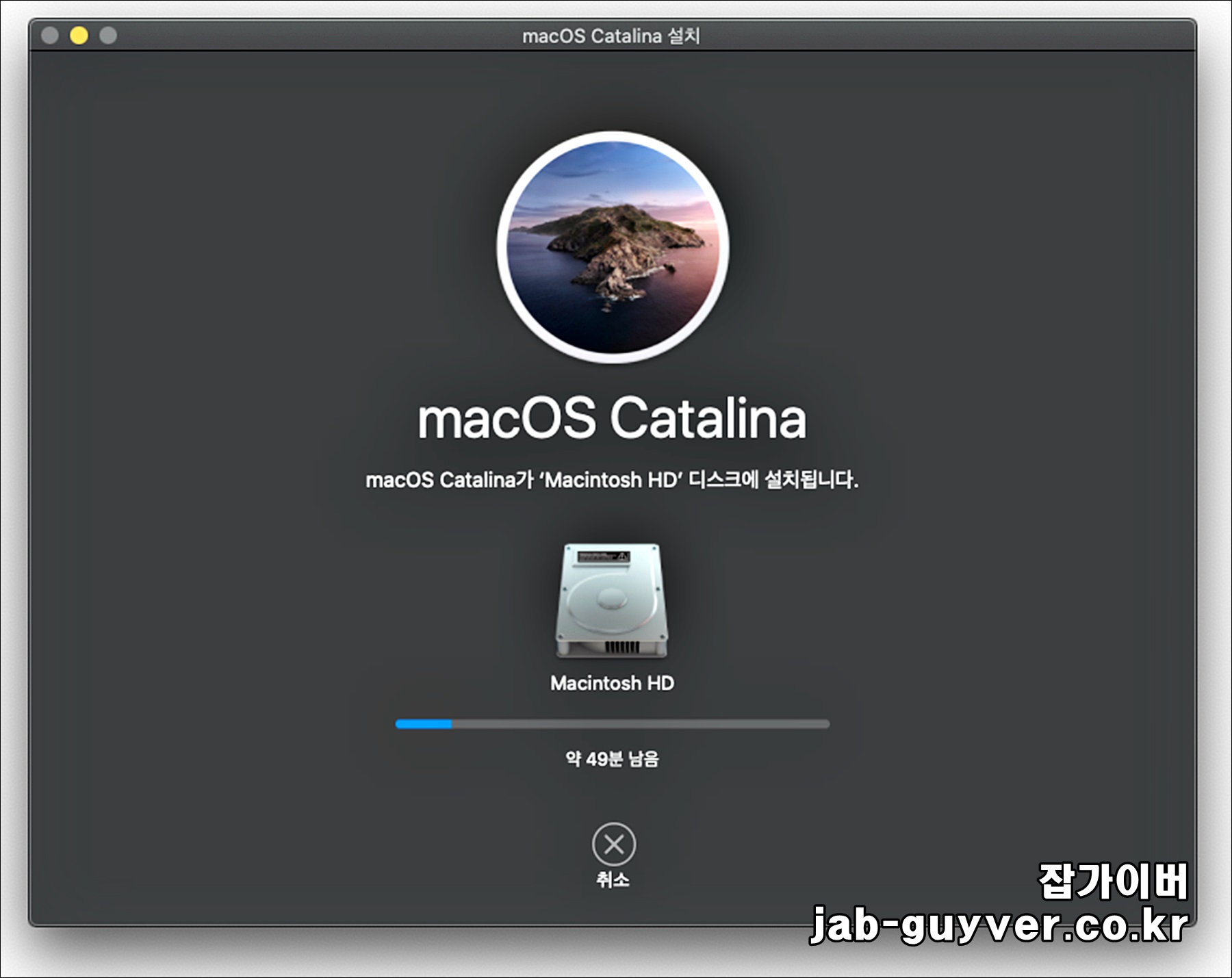 그럼 현재 최신 맥 운영체제인 MacOS Catalina가 설치가 되며 설치하는데 걸리는 시간도 함께 표시됩니다.