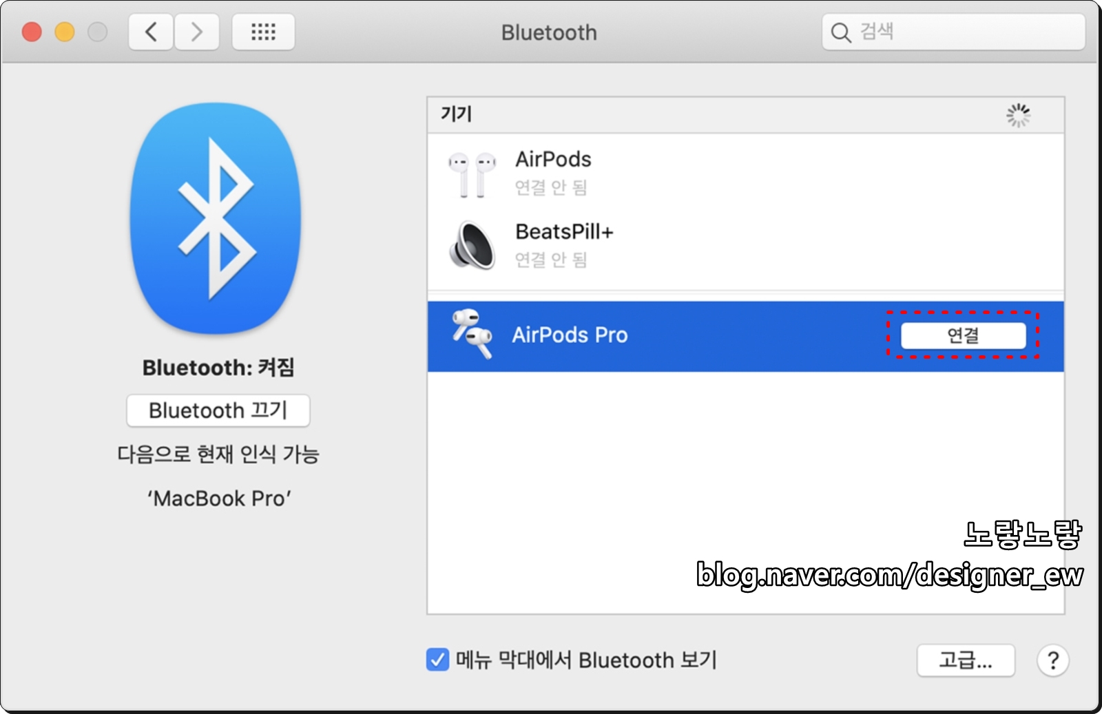 - 맥북에서 블루투스가 켜져 있는지 확인합니다.