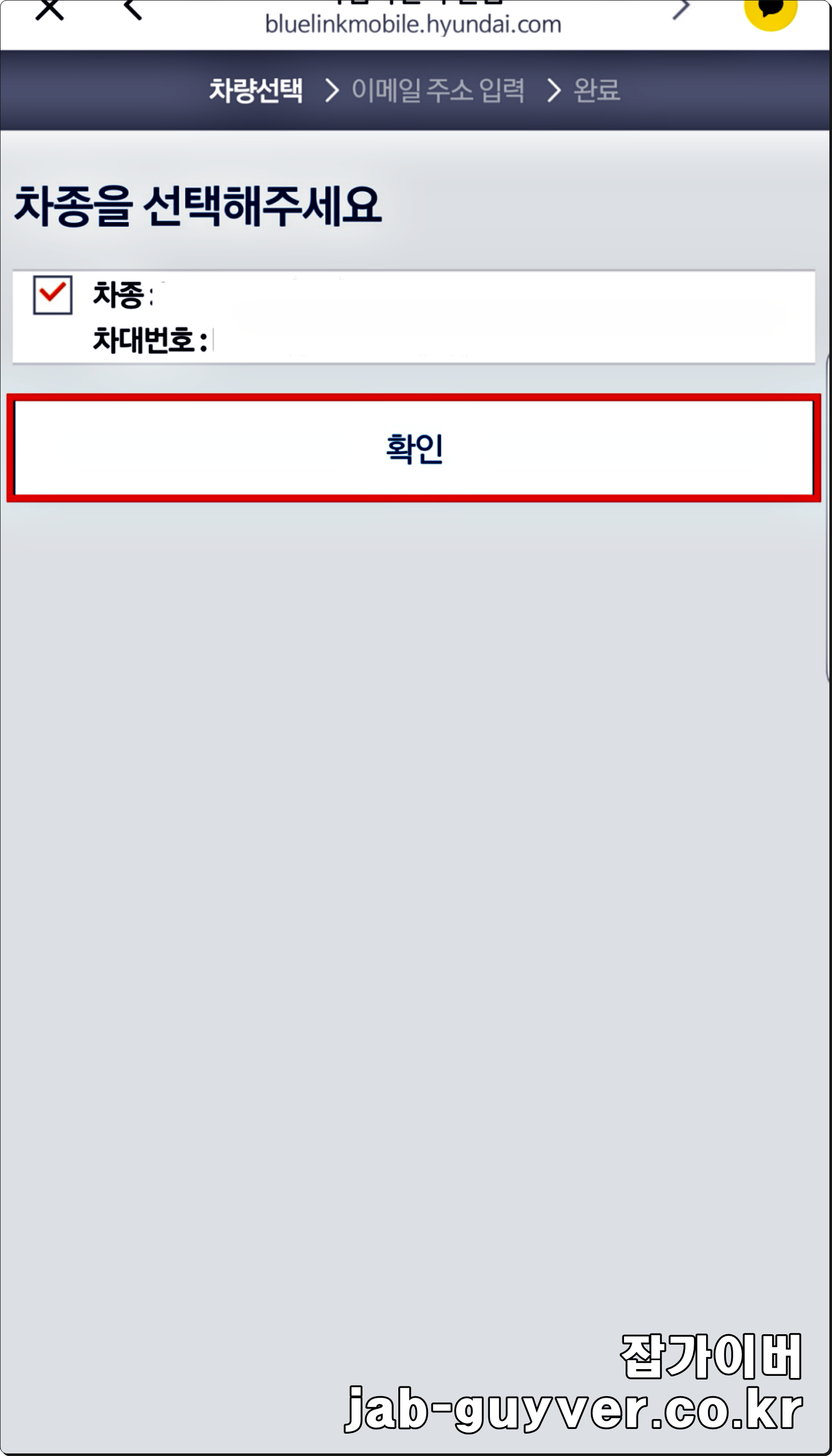 자신의 차동 및 차대번호를 확인 후 문제가 되지 않는다면 확인을 눌러줍니다.