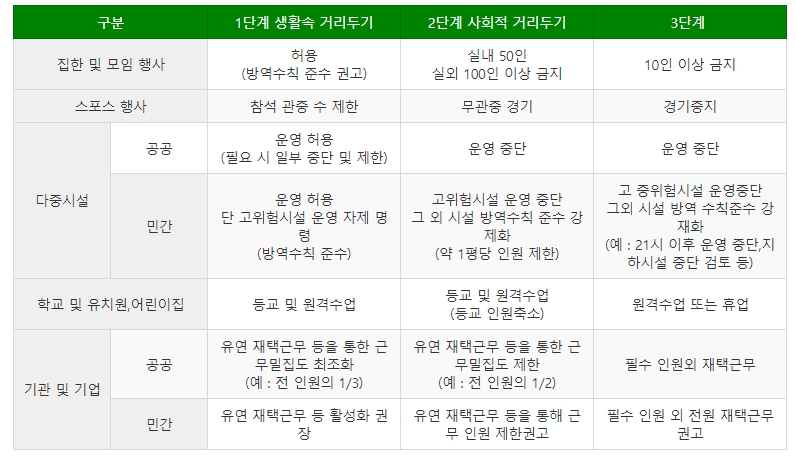 | 구분 | 1단계 생활속 거리두기 | 2단계 사회적 거리두기 | 3단계 | |