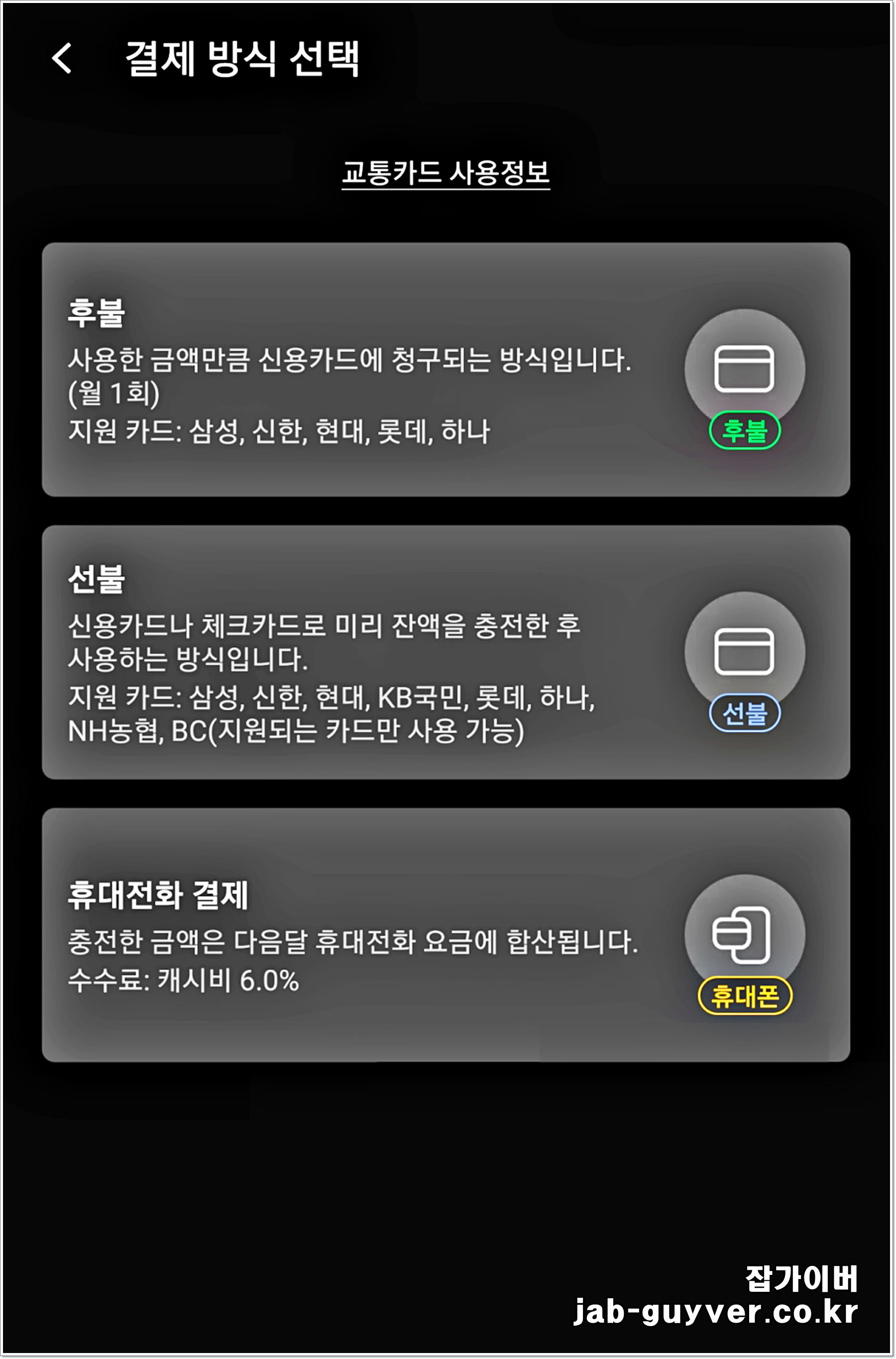 교통카드의 경우 후불카드와 선불카드 그리고 휴대전화 결제 3가지로 선택이 가능합니다.