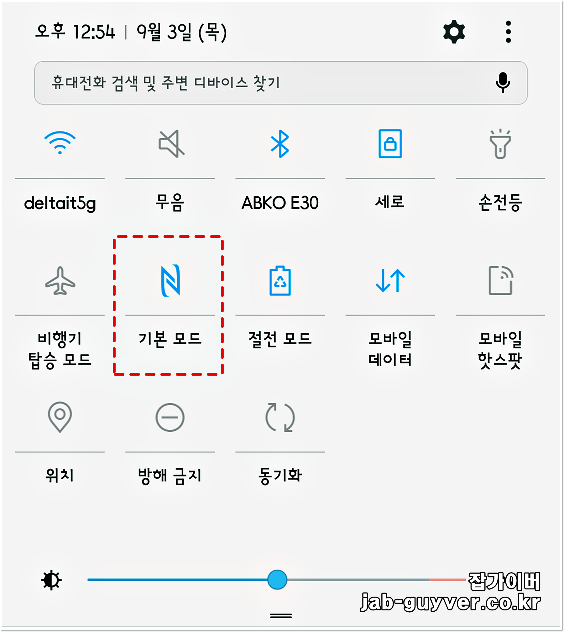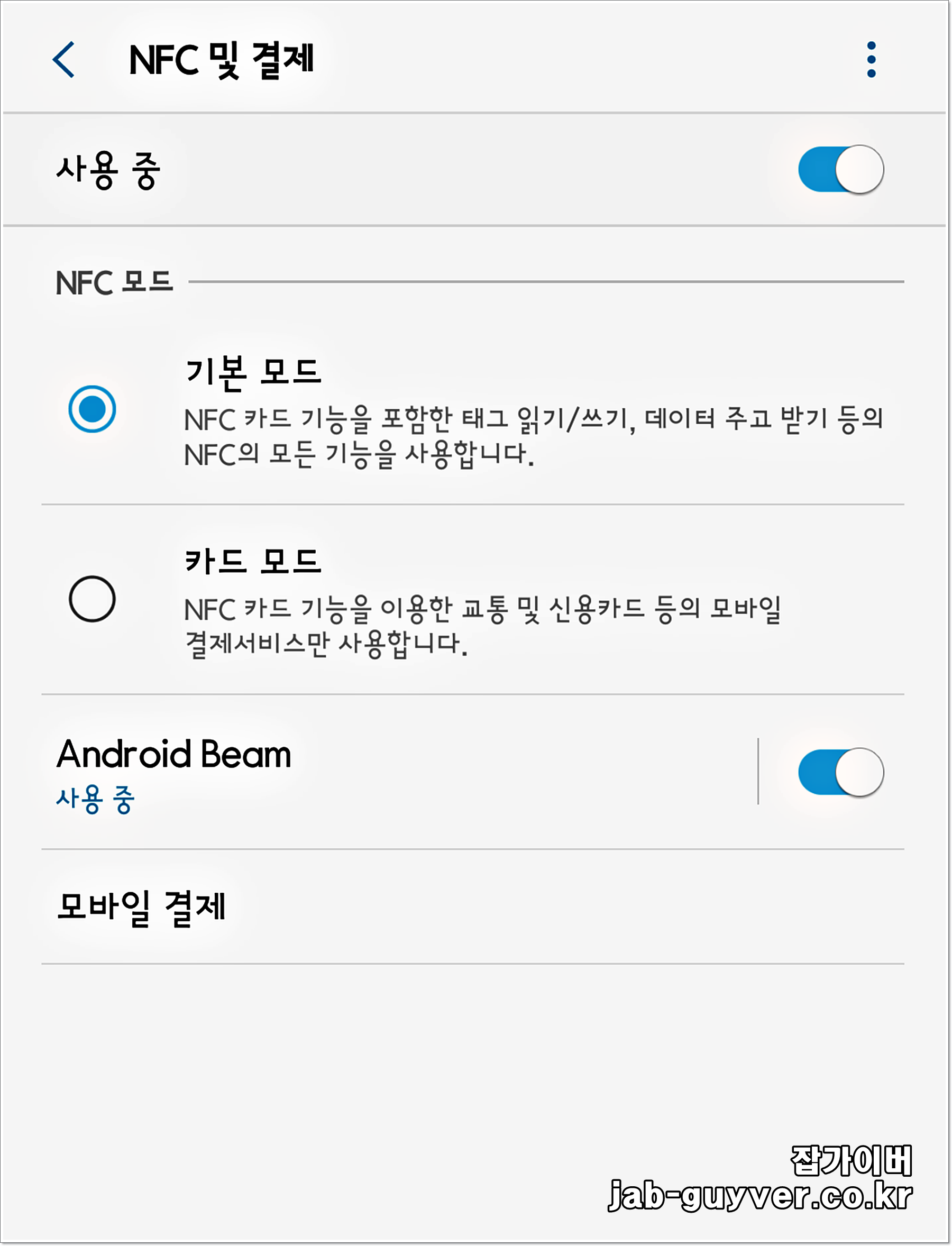카드 등록이 되었다면 사용 중인 갤럭시 시리즈의 NFC기능을 활성화되었지 확인합니다.