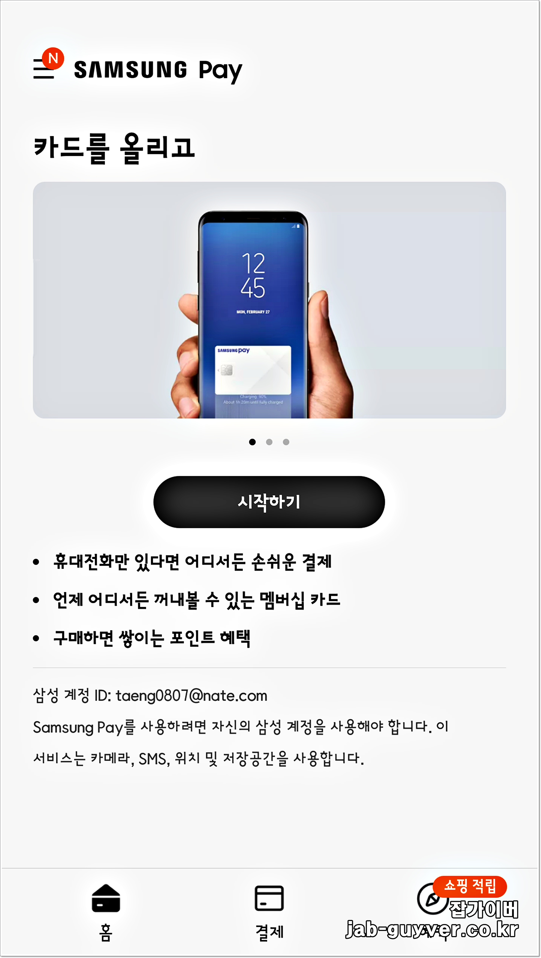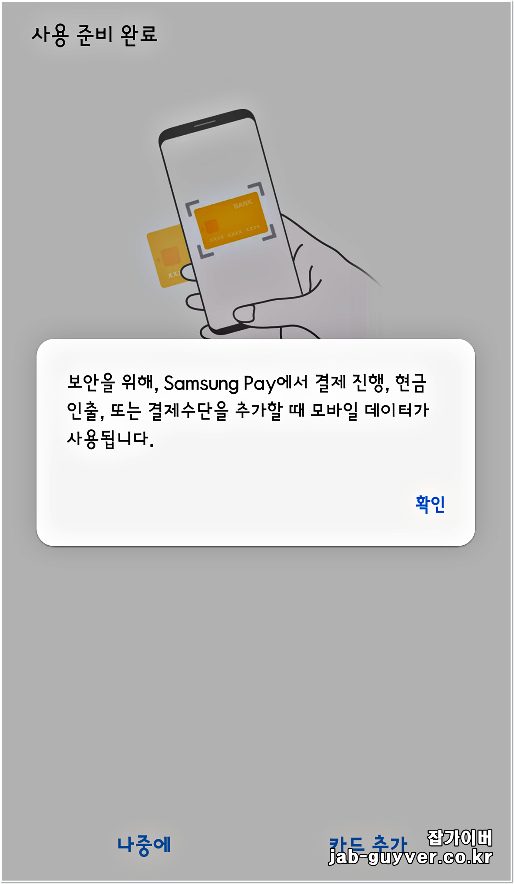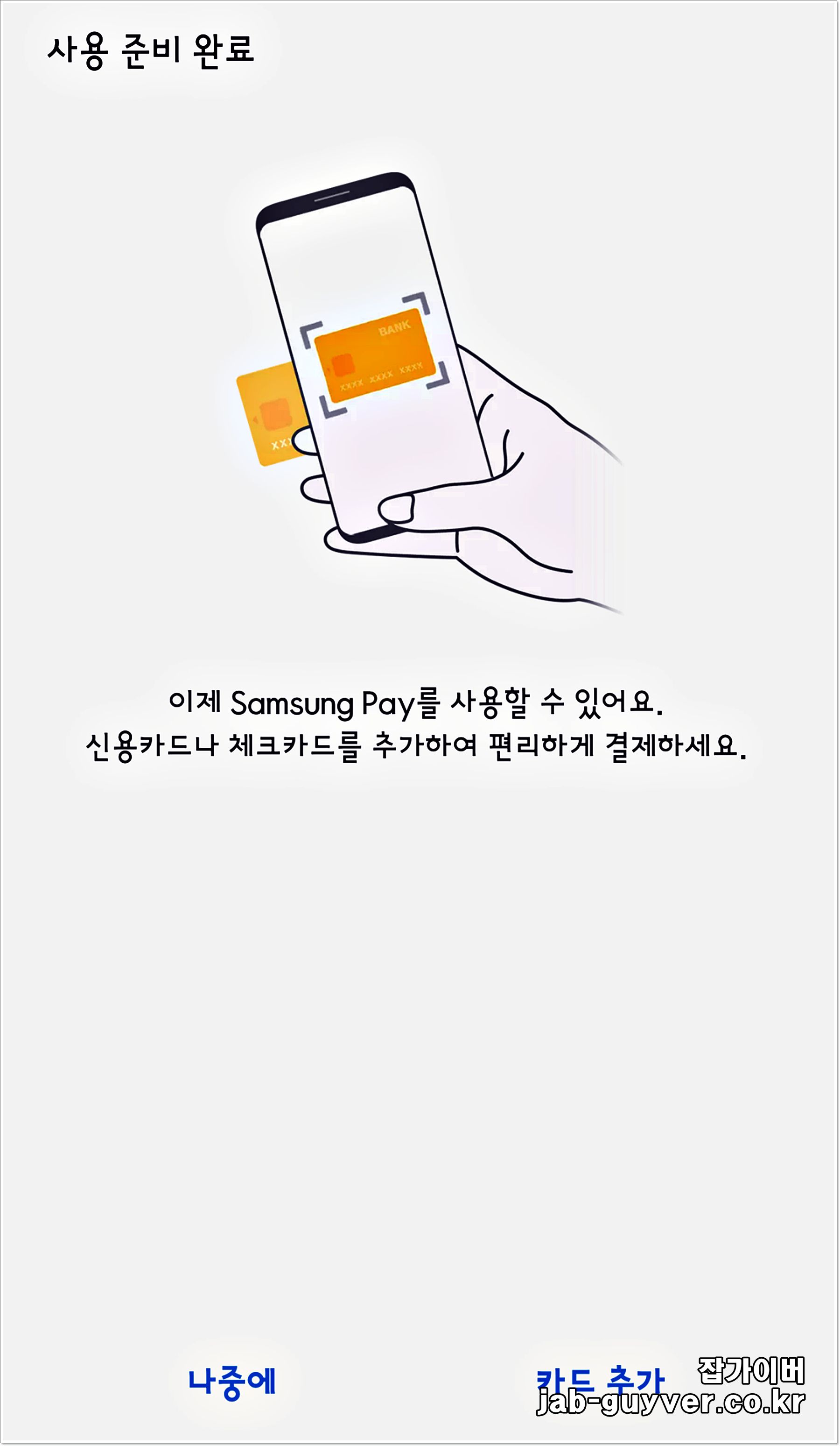 이렇게 삼성페이의 보안설정이 완료되었다면 신용카드나 체크카드를 등록할 수 있습니다.