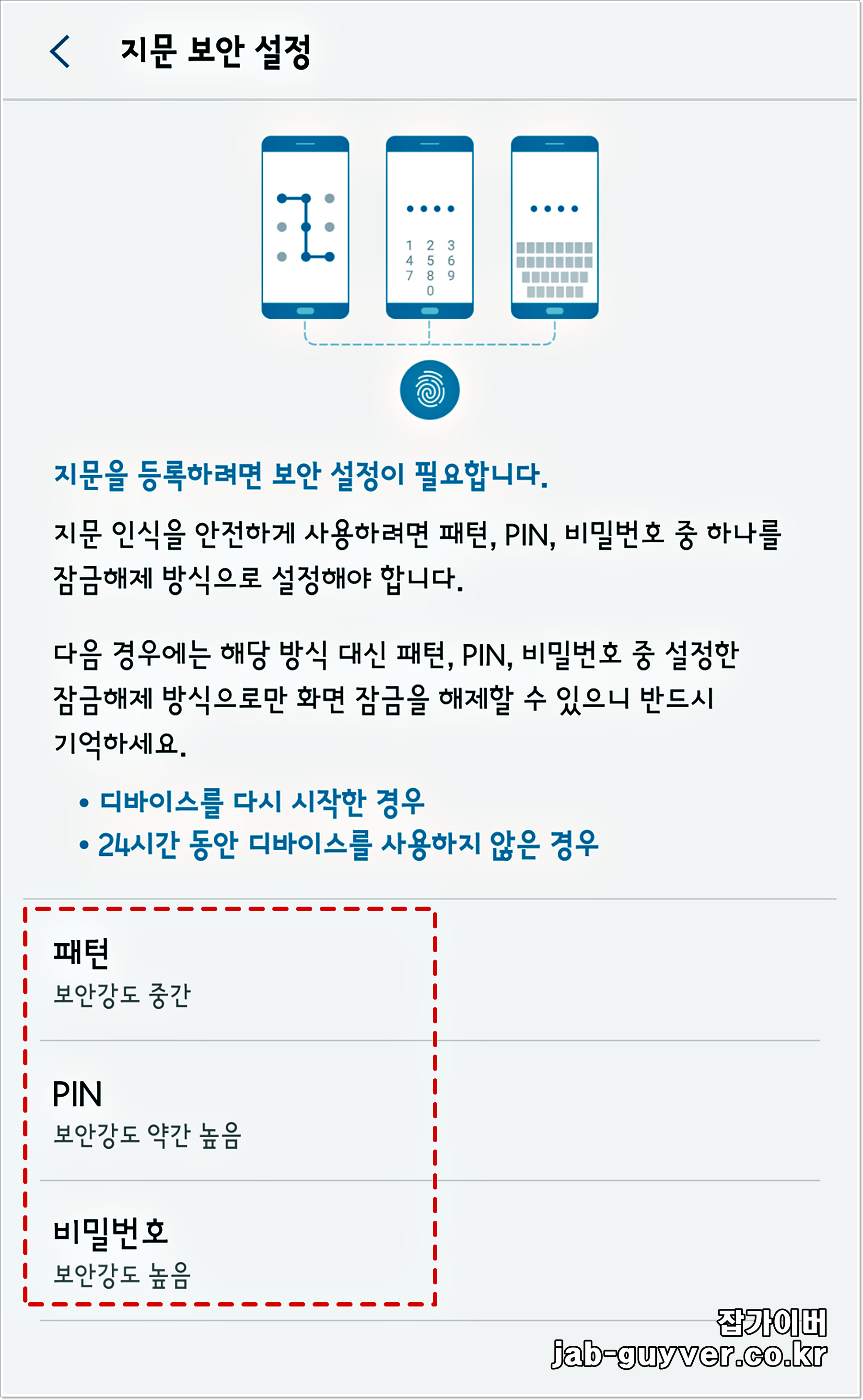 그 외에도 패턴보안이나 PIN번호, 비밀번호 등 중 하나를 선택할 수 있습니다.