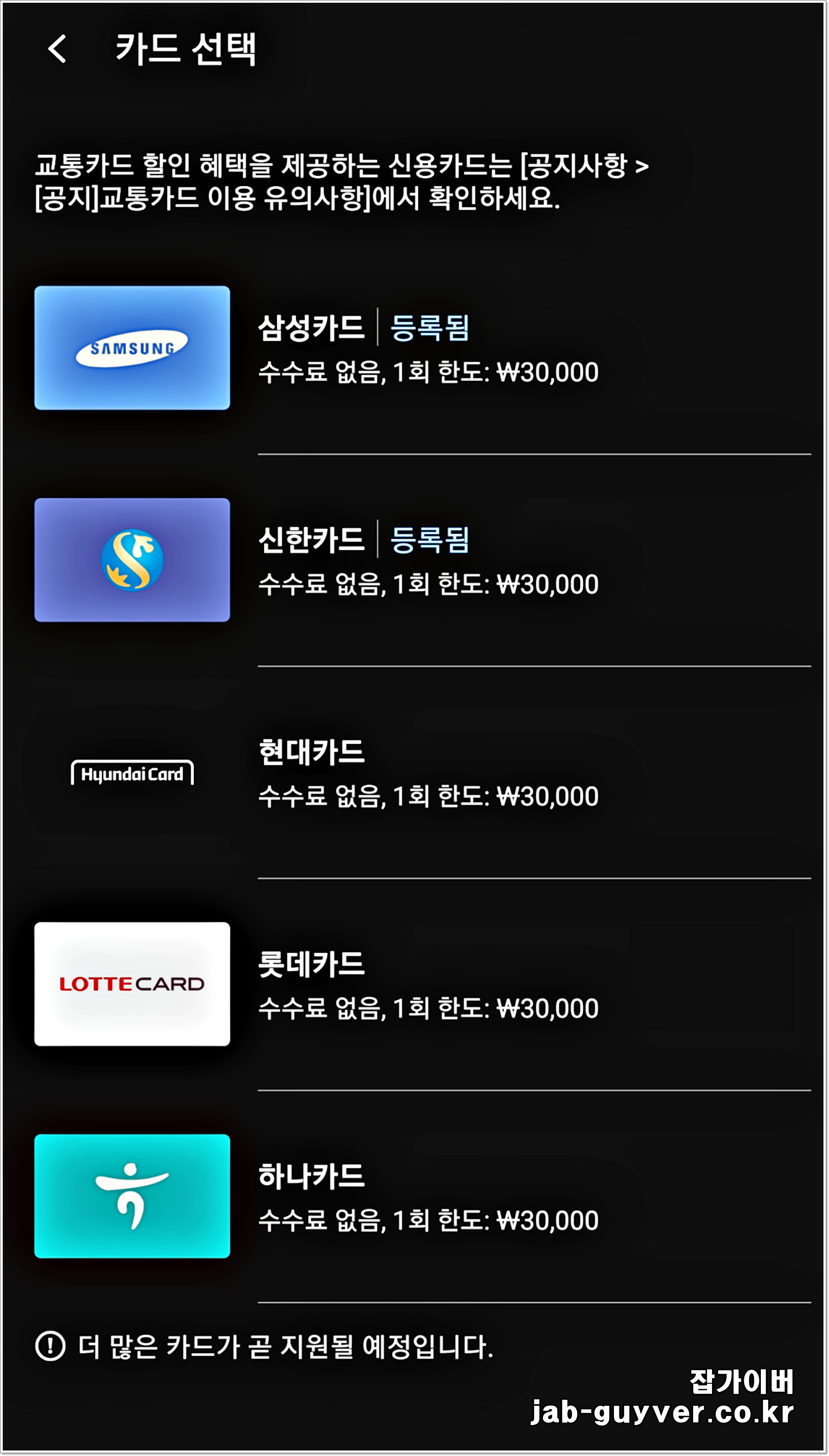 카드 선택시에 각 카드사마다 한도와 수수료를 참고하세요