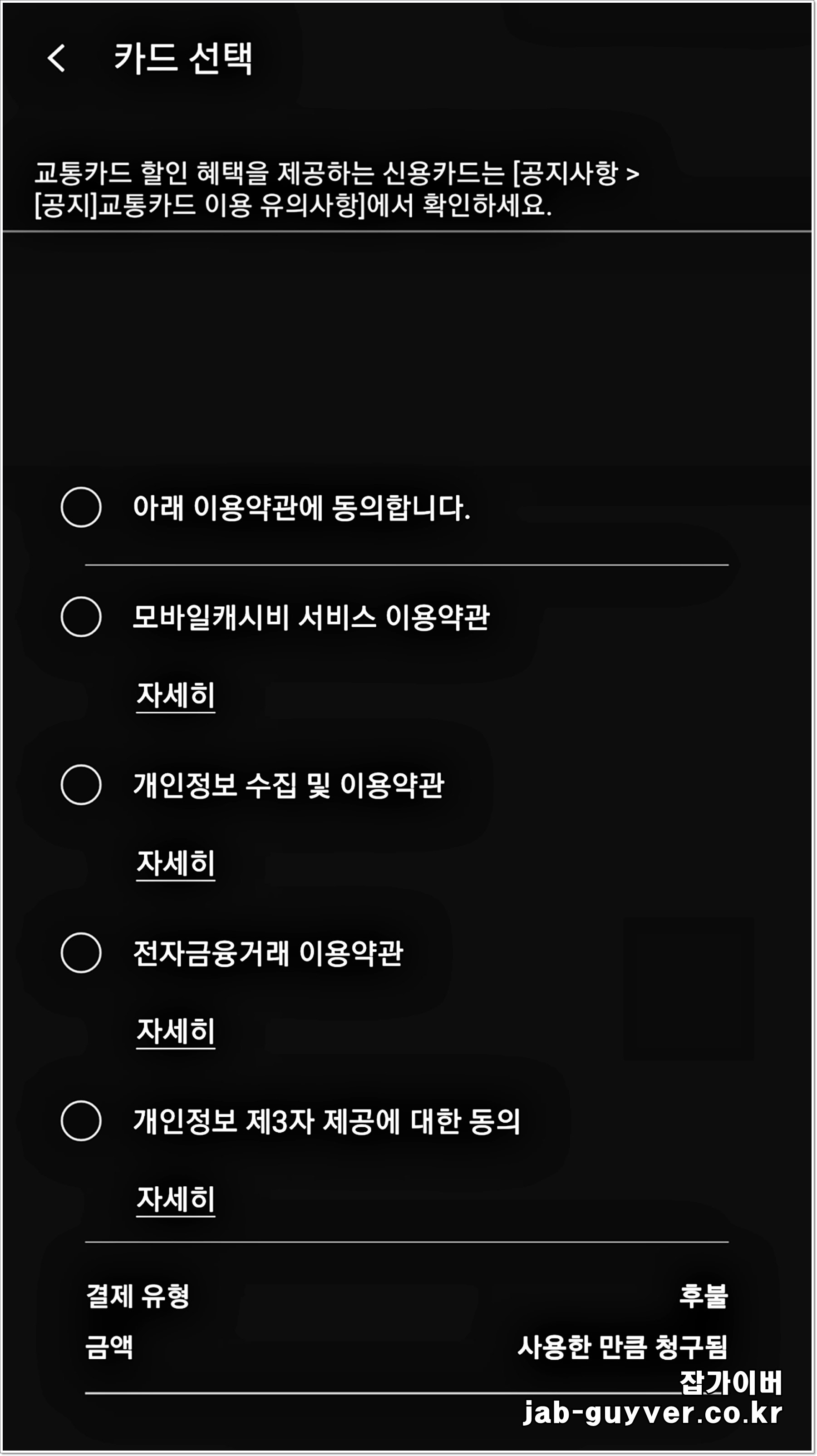 교통카드의 경우 후불카드와 선불카드 그리고 휴대전화 결제 3가지로 선택이 가능합니다.