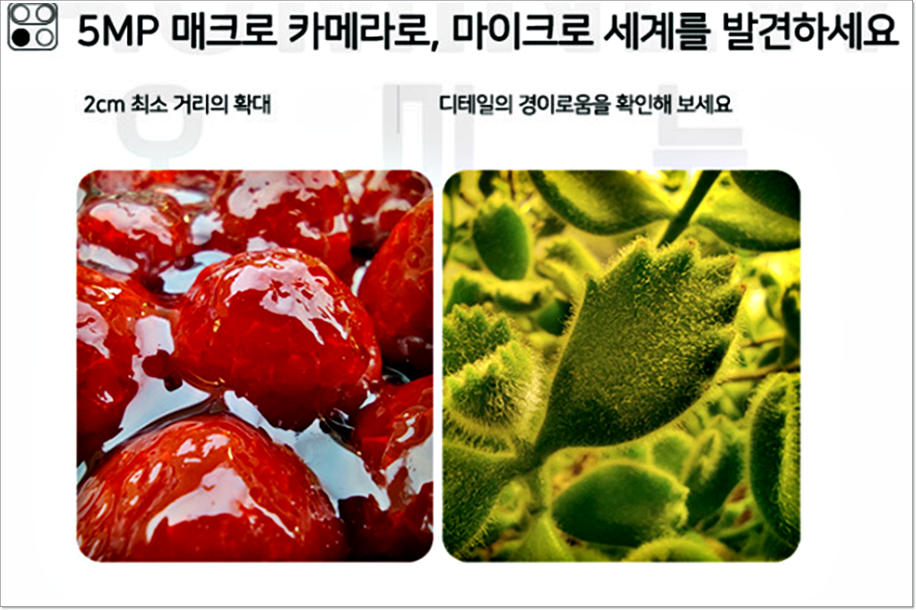 3개의 렌즈로 광각렌즈와 48mp의 4800만 화소, 그리고 매크로 렌즈가 장착되었으며 그 외에도 문서나 종이를 스캔할 수 있는 기능이 탑재되어 별도의 앱"CamScanner"캠 스캐너와 같은 앱을 추가로 설치할 필요가 없습니다.