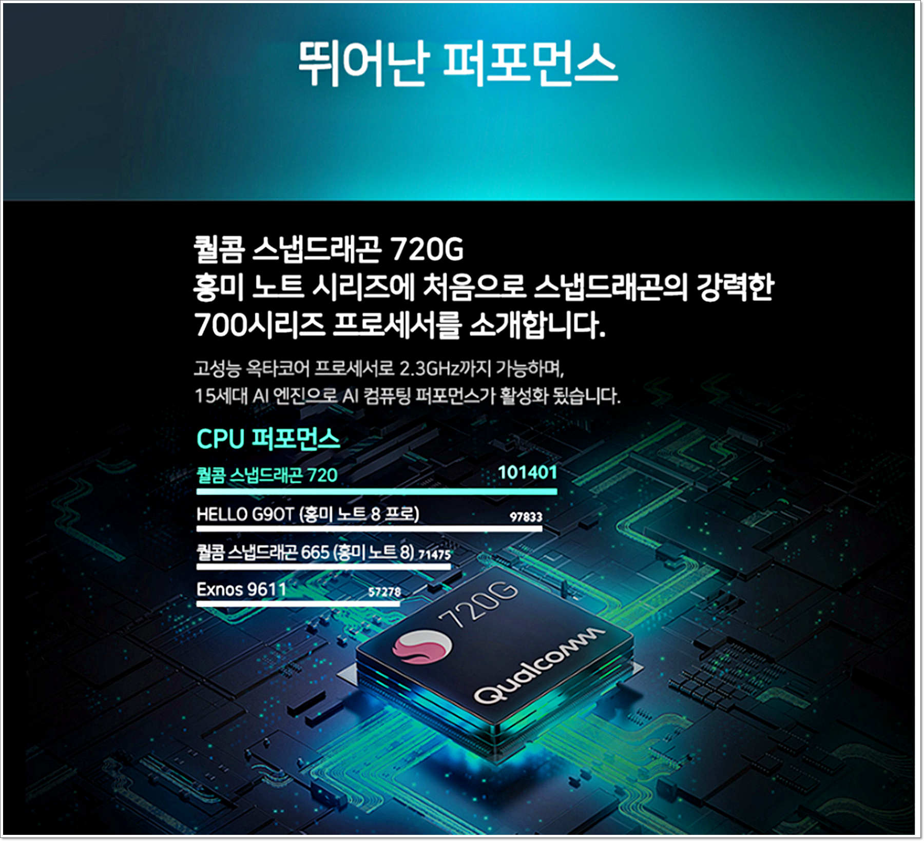 스냅드래곤 720G (G_게이밍 특화) 2.3GHz x2 + 1.8Hz x 6 (옥타) |