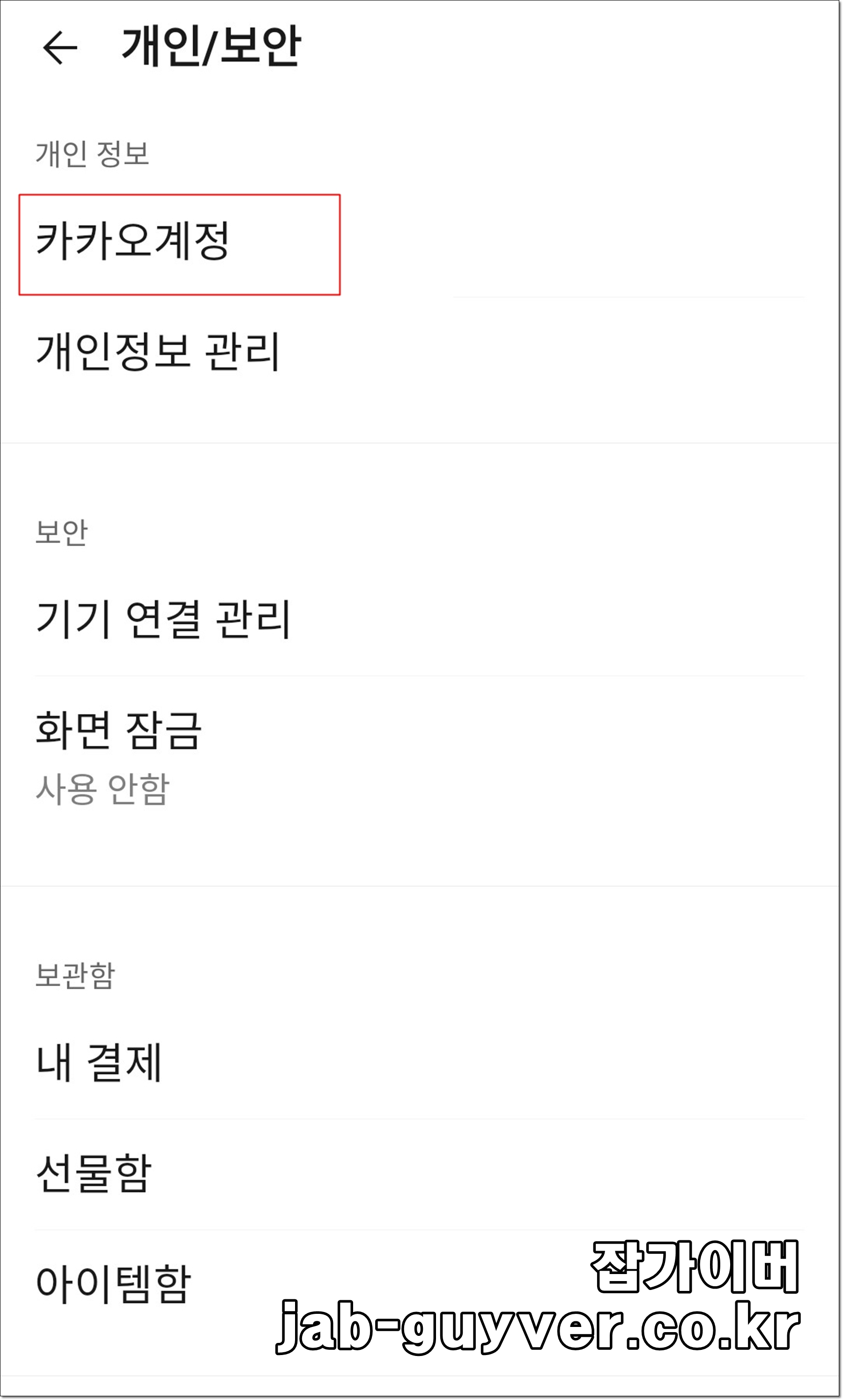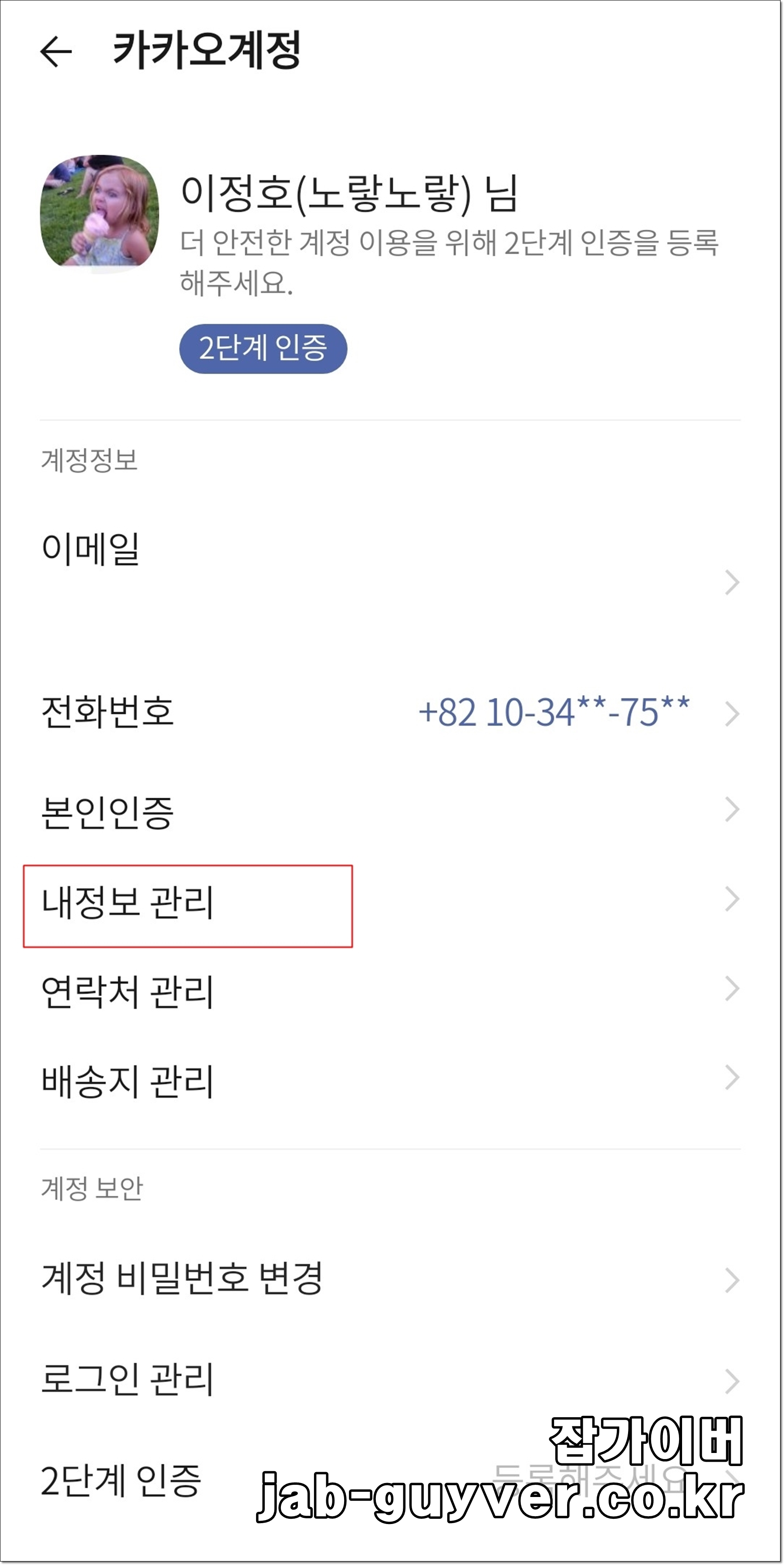 개인보안에서 카카오계정 내정보 관리로 이동