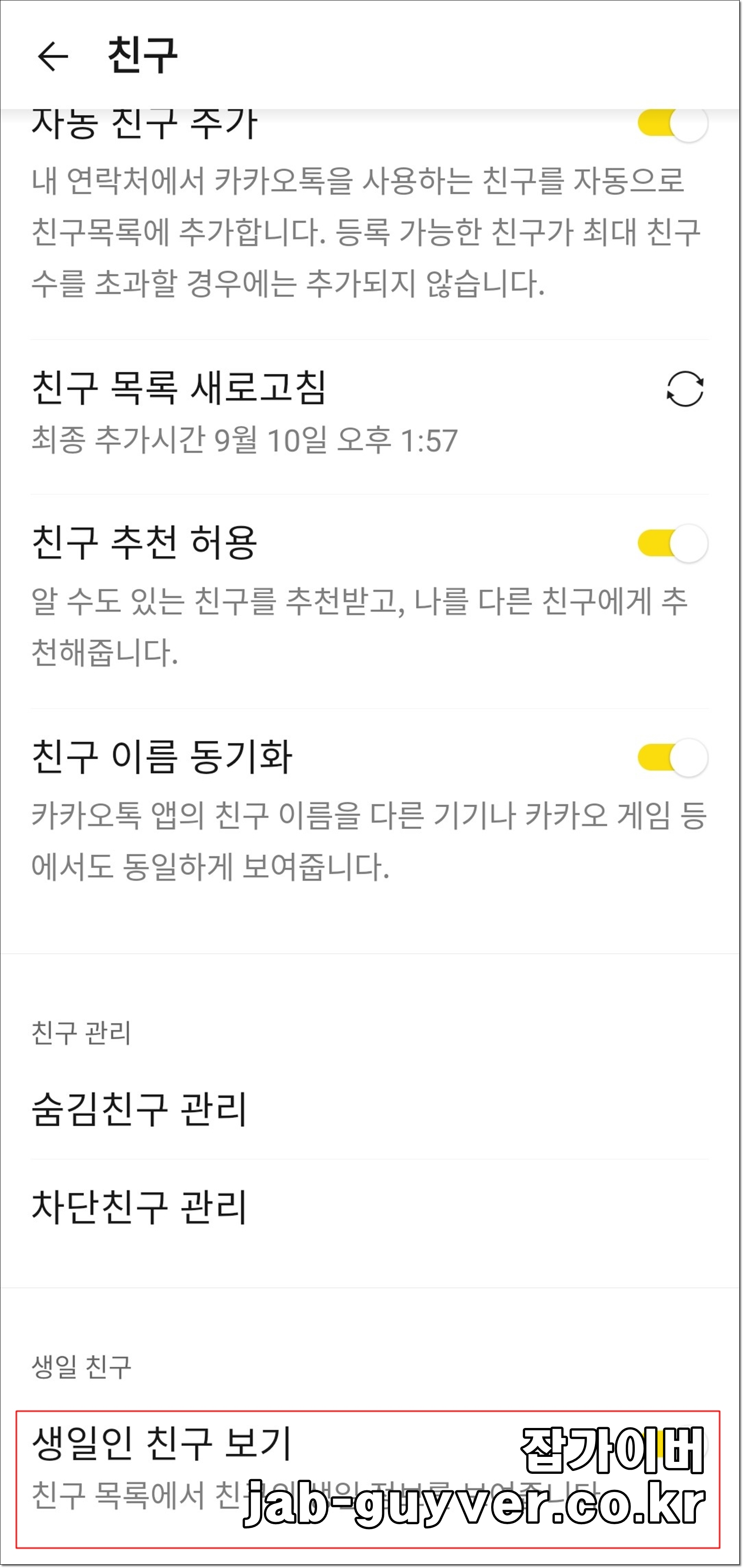 친구 목록에서 생일인 친구 표시를 줄이는 방법