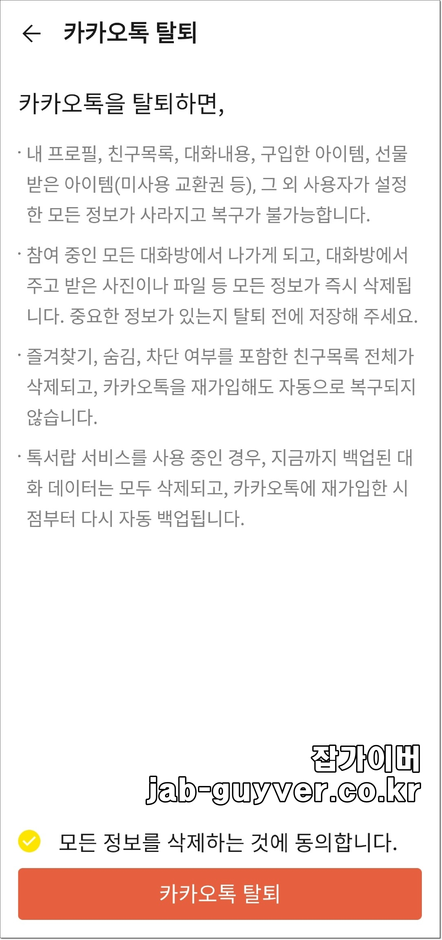 추가로 즐겨찾기 및 숨김 차단 친구 등의 정보가 모두 삭제되며 카카오톡 재가입 후에는 복구가 되지 않습니다.