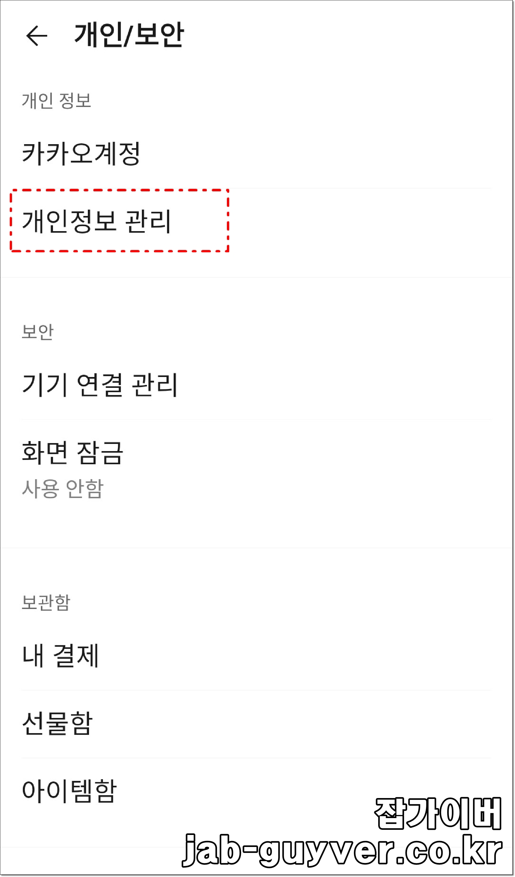 - 설정 -> 개인/보안 -> 개인정보 관리를 선택합니다.