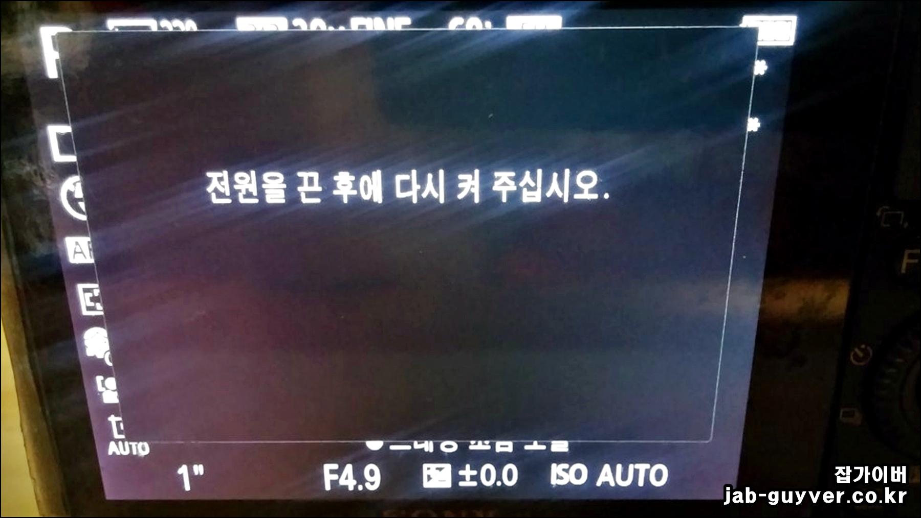 카메라의 증상은 "전원을 끈 후에 다시 켜 주십시오"라고 표시되면서 제대로 작동이 되지 않는 상태입니다.