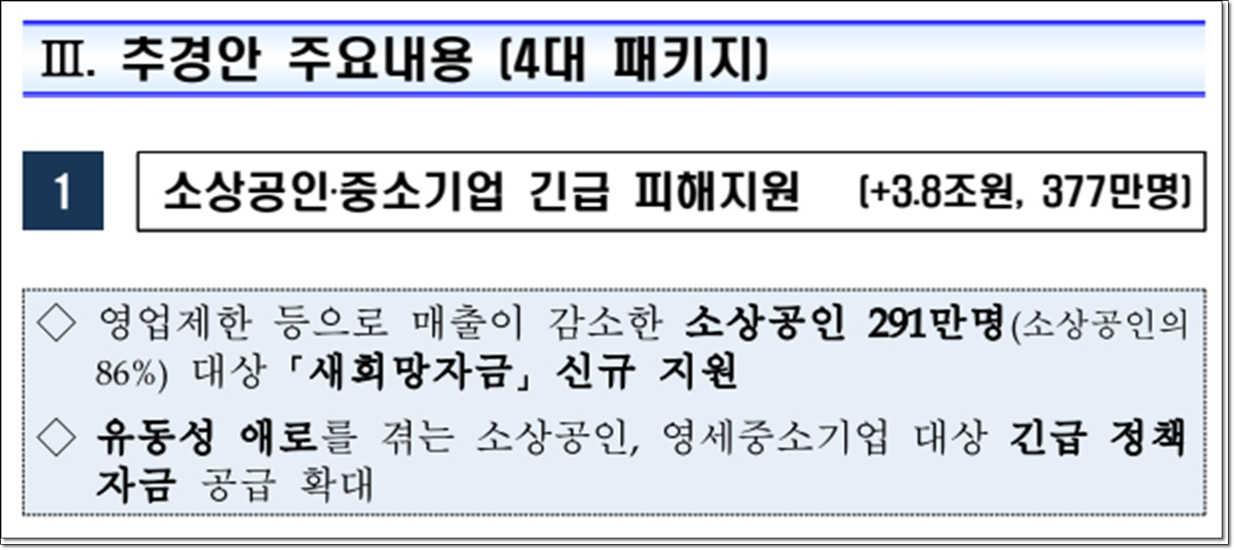 1·2단계 금융지원을 받은 소상공인 50만 명도 중복 지원이 가능하며 신용보증기금을 통해 공연 및 관광업 등 내수 위축을 피해를 본 중소기업을 대상으로 기술보증금 및 수출 벤처 등 기술 중소기업 대상으로 공급합니다.