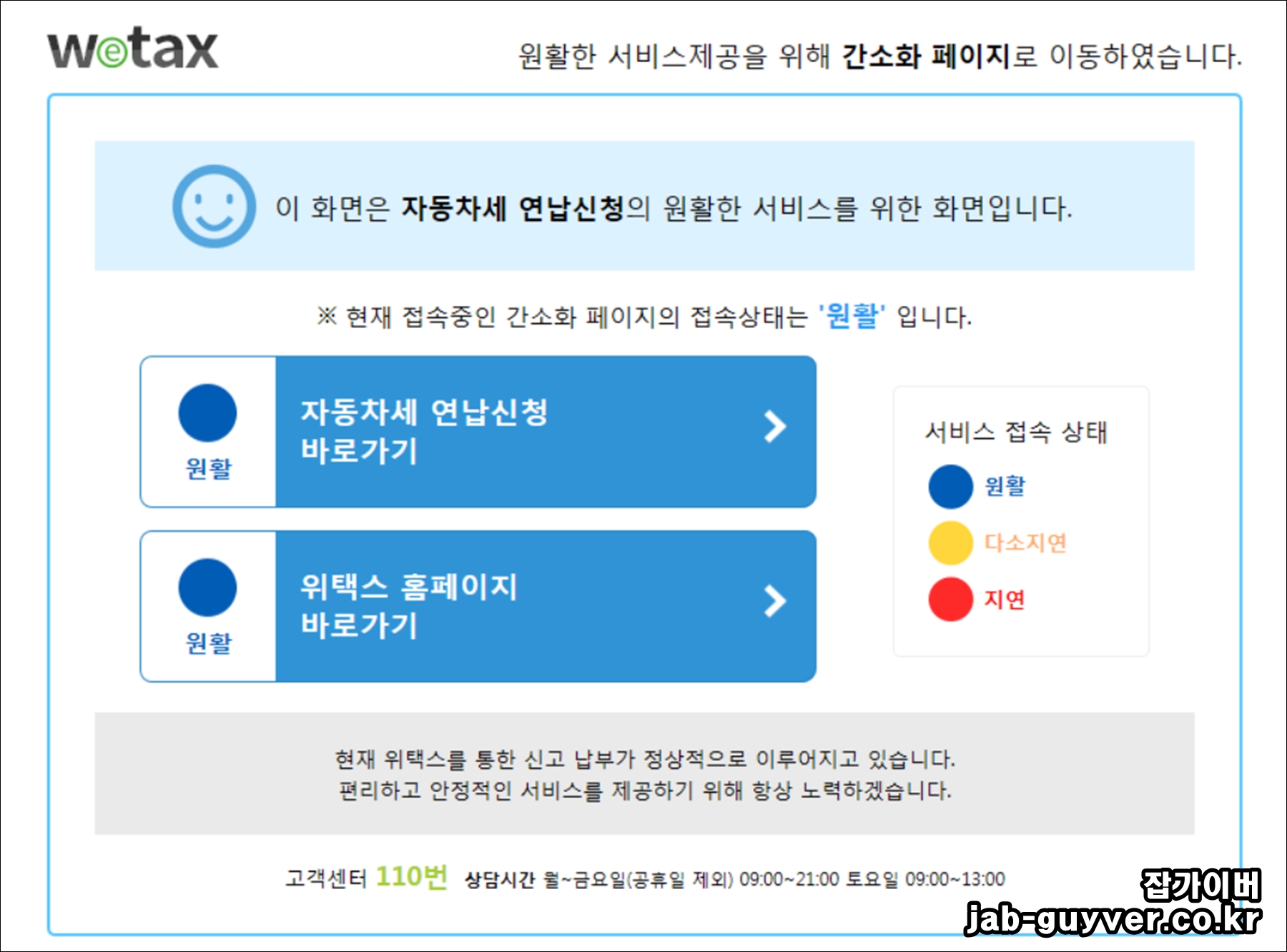 위택스 사이트로 접속하면 자동차세 납부기간에는 안내 페이지가 표시됩니다. 연납을 원하면 자동차세 연납신청 메뉴에서 조회를 먼저 합니다.