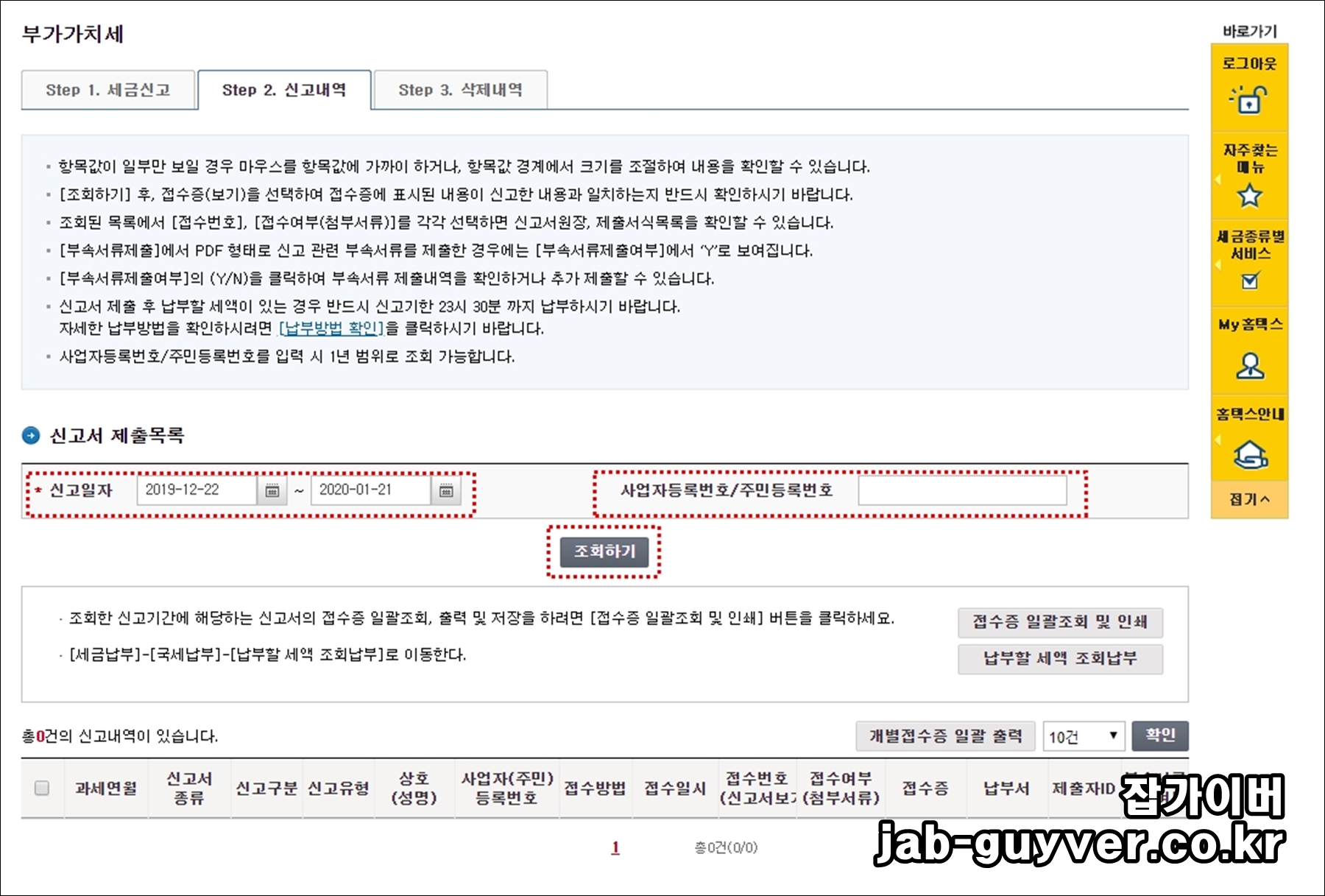 신고 일자 및 사업자등록번호 및 주민등록번호를 입력 후 조회합니다.