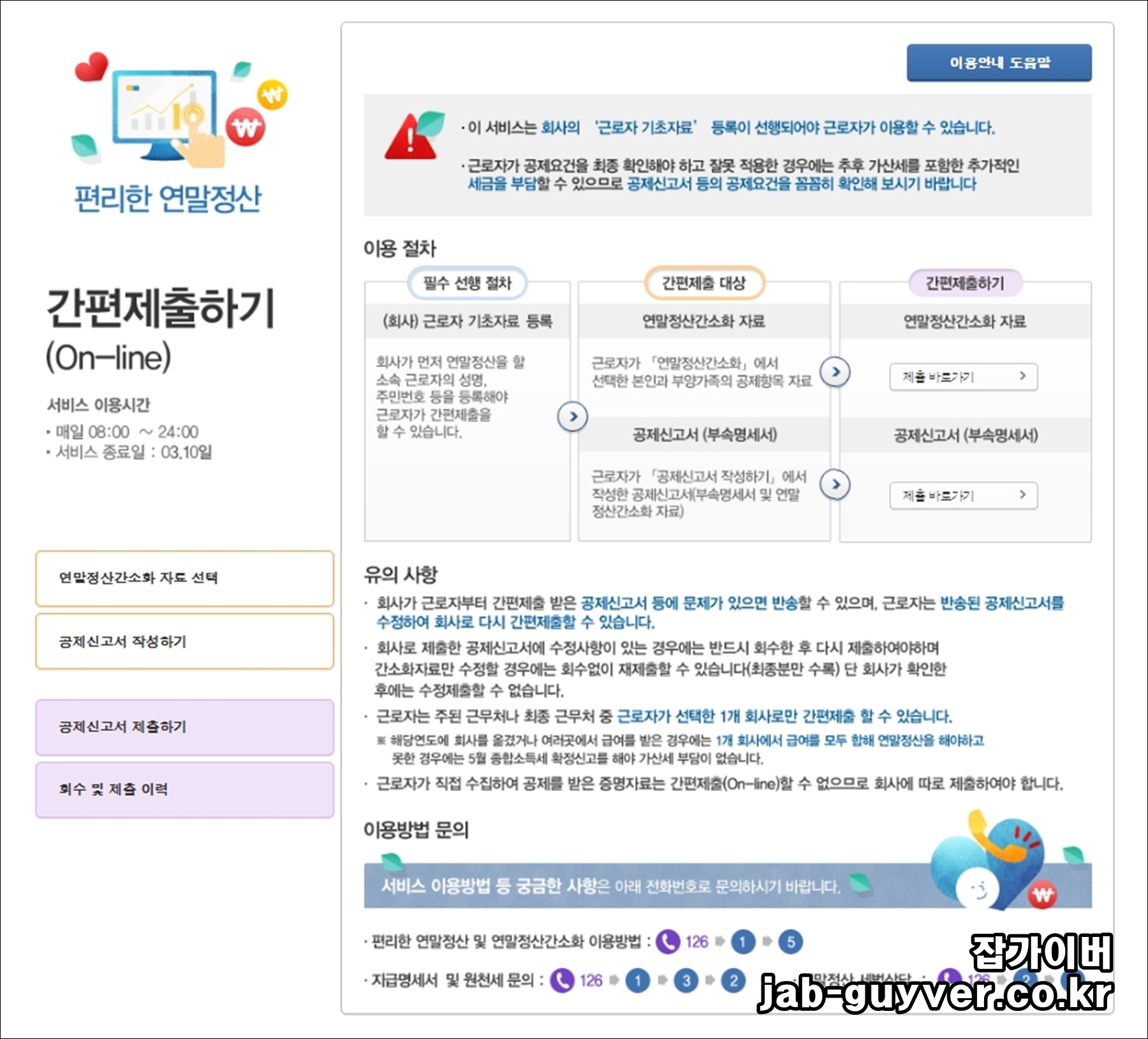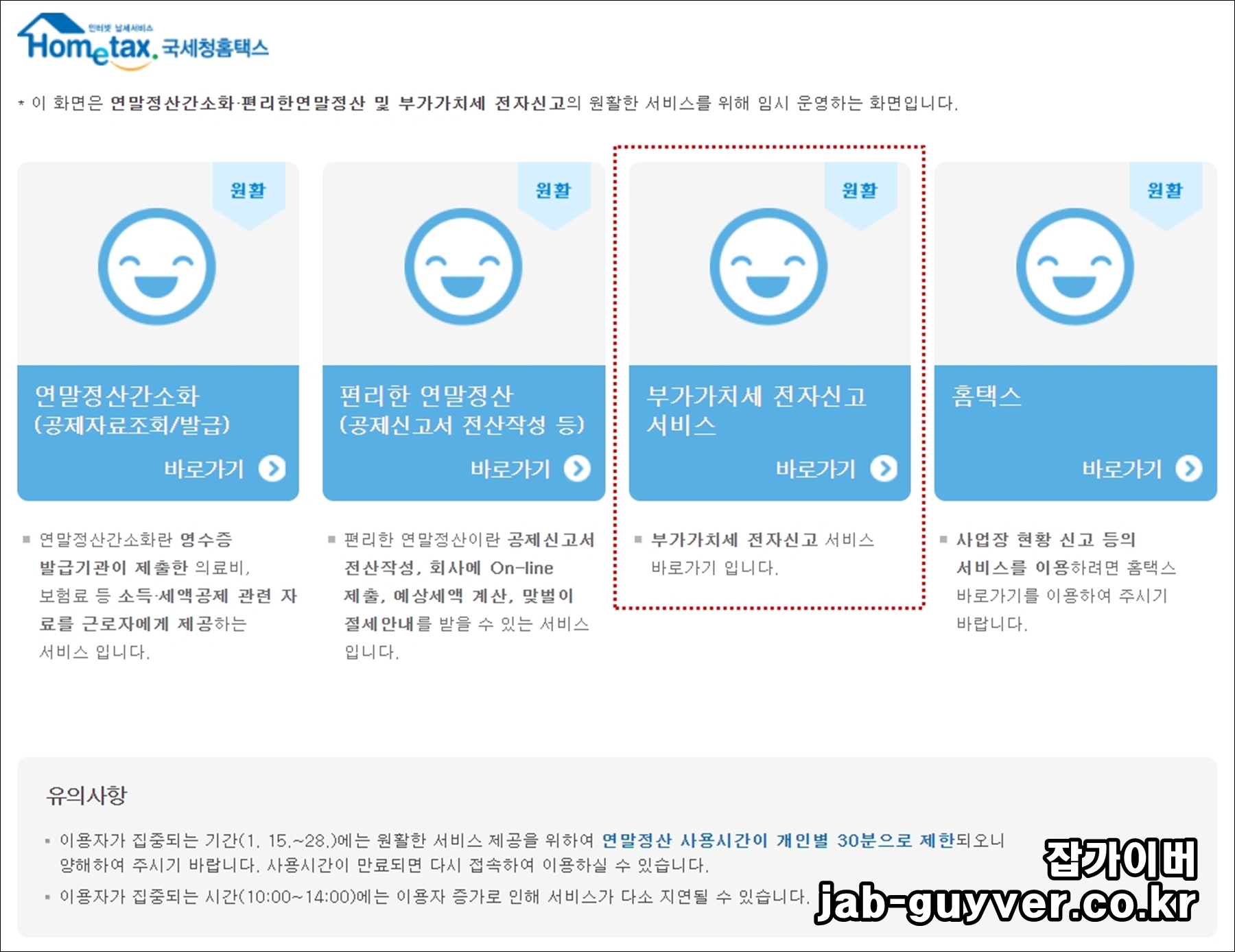 연말정산 기간에는 특히 사람들이 몰리기 때문에 1월15일 부터 28일가지는 원할한 서비스 제공을 위해 연말정산 사용시간을 개인별 30분으로 제약합니다.