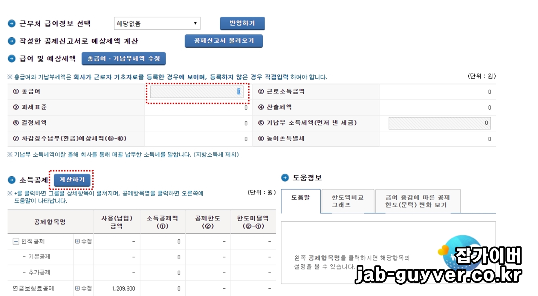 총 급여를 입력 후 소득공제 계산하기를 통해 얼만큼 공제를 받을 수 있는지 알 수 있습니다.