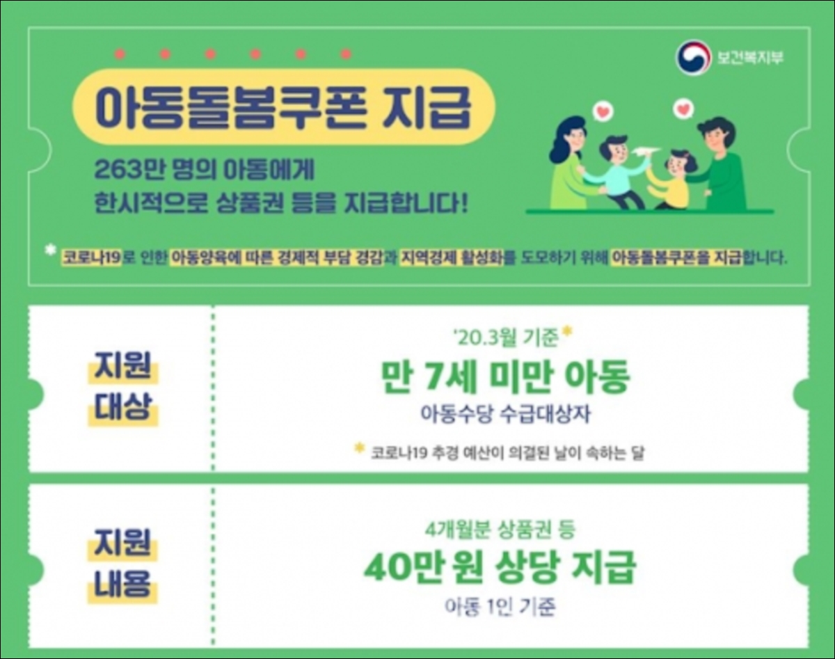 2020년 3월 27일에 발표한 1차 재난지원금으로서 아동수당을 지급받는 만 7세 미만의 아동들에게 1인당 40만 원을 "아동돌봄쿠폰"으로 지급하는 사업입니다.