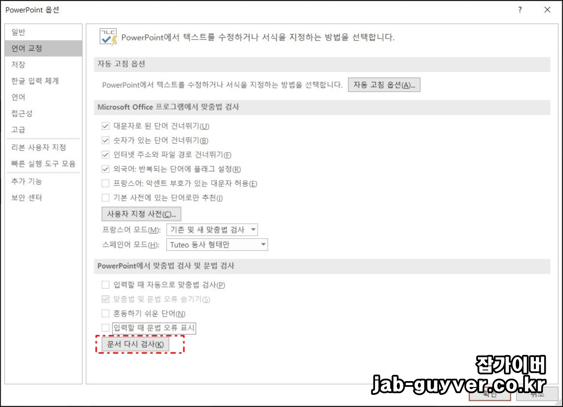 언어교정탭을 선택하면 다양한 오피스 프로그램의 맞춤법 검사기능을 제공합니다.